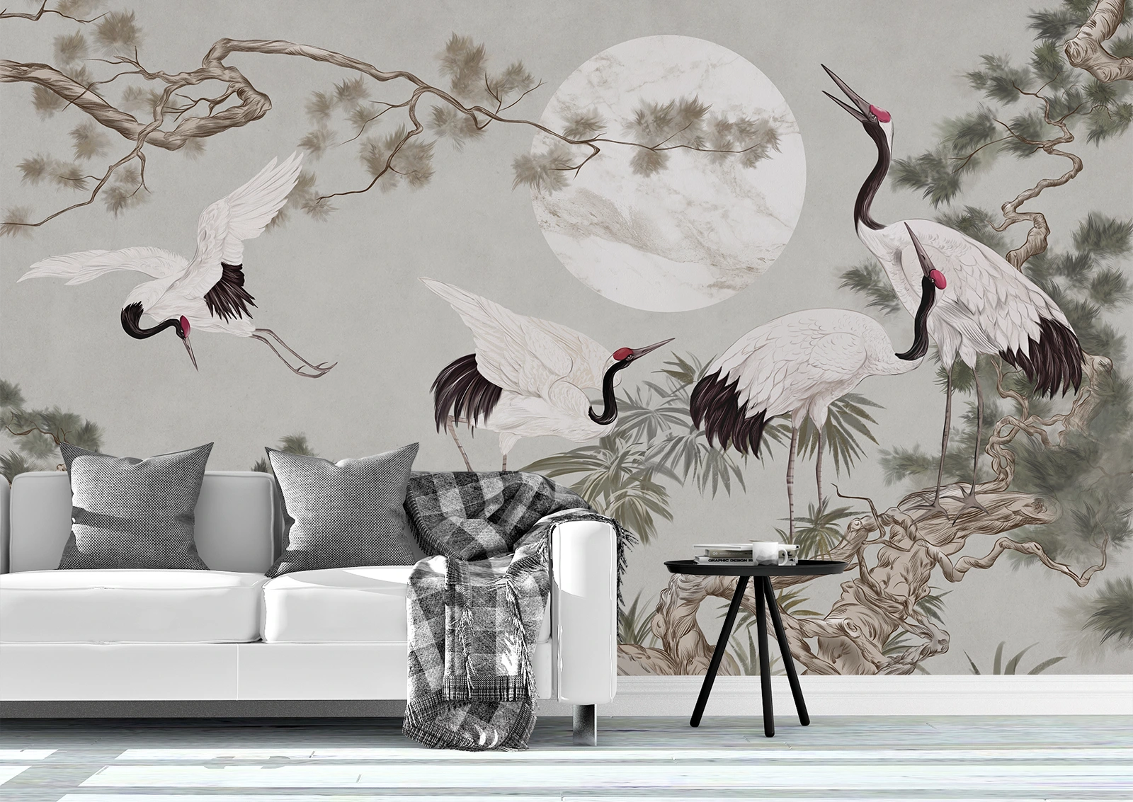 Fototapetul cu cocori și lună plină aduce un strop de rafinament oriental în orice locuință. Designul elegant, cu detalii fine și nuanțe calme, creează o atmosferă de liniște și armonie. Este alegerea ideală pentru living sau dormitor, completând perfect un interior sofisticat.
