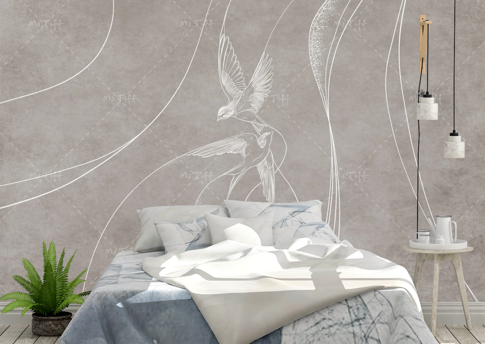 Acest fototapet minimalist surprinde frumusețea delicată a rândunelelor în zbor, desenate în linii fine pe un fundal neutru gri-bej. Creează un efect calm și elegant, perfect pentru dormitoare sau livinguri moderne, oferind un aer de libertate și rafinament.