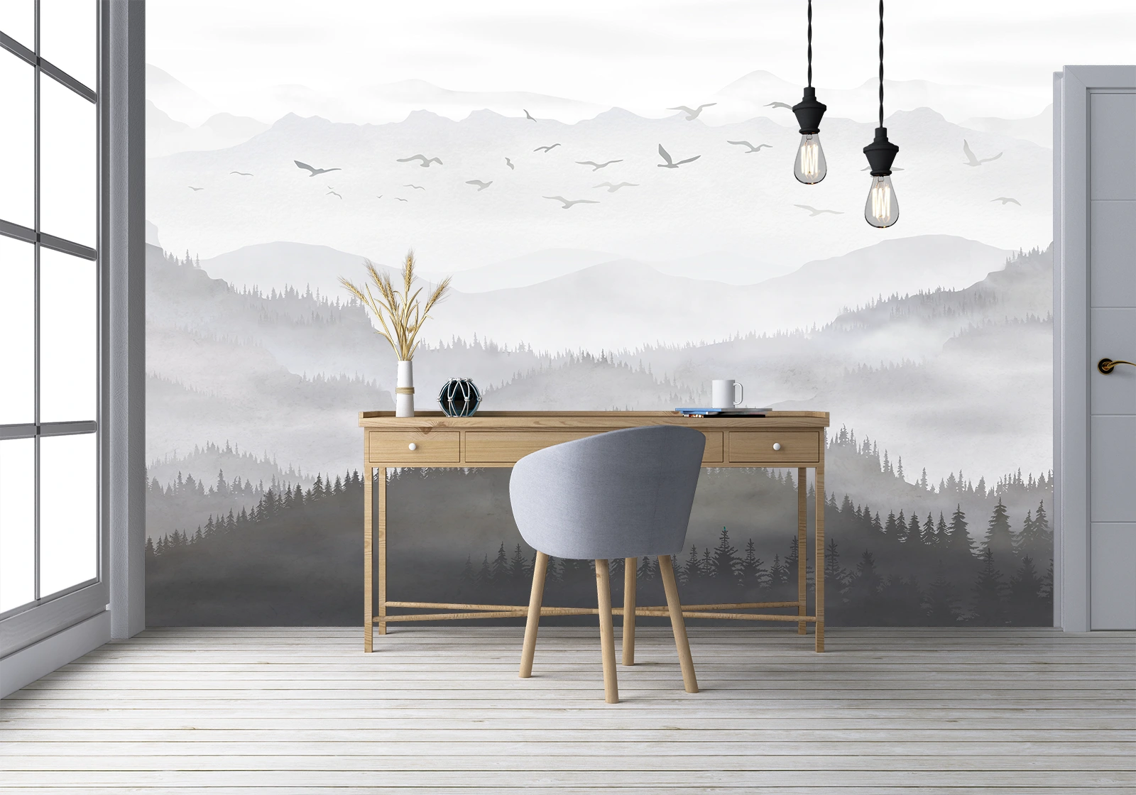 Fototapetul cu munți și pădure învăluită în ceață creează o atmosferă calmă și relaxantă, perfectă pentru spații moderne și minimaliste. Tonurile neutre de gri se integrează armonios în orice decor, oferind profunzime și senzația de liniște. Acest tip de fototapet este ideal atât pentru birou, cât și pentru dormitor, transformând orice încăpere într-un refugiu de pace și inspirație.