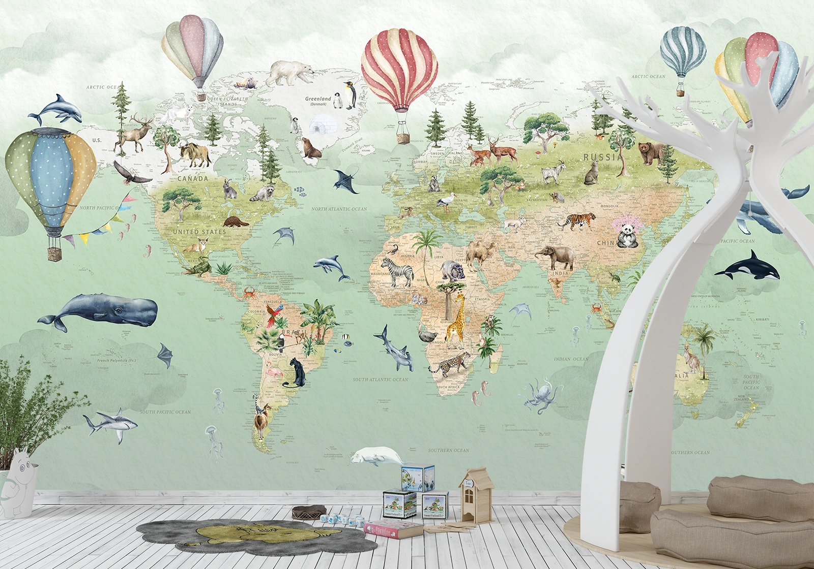 Acest tapet pentru camera copilului nu doar că adaugă un element educativ, dar și unul estetic. Cu un design colorat și vibrant, fototapetul transformă orice perete într-un punct de interes major. Elementele suplimentare, cum ar fi baloanele cu aer cald, aduc un plus de fantezie și creativitate, făcând încăperea mai atractivă și mai primitoare.