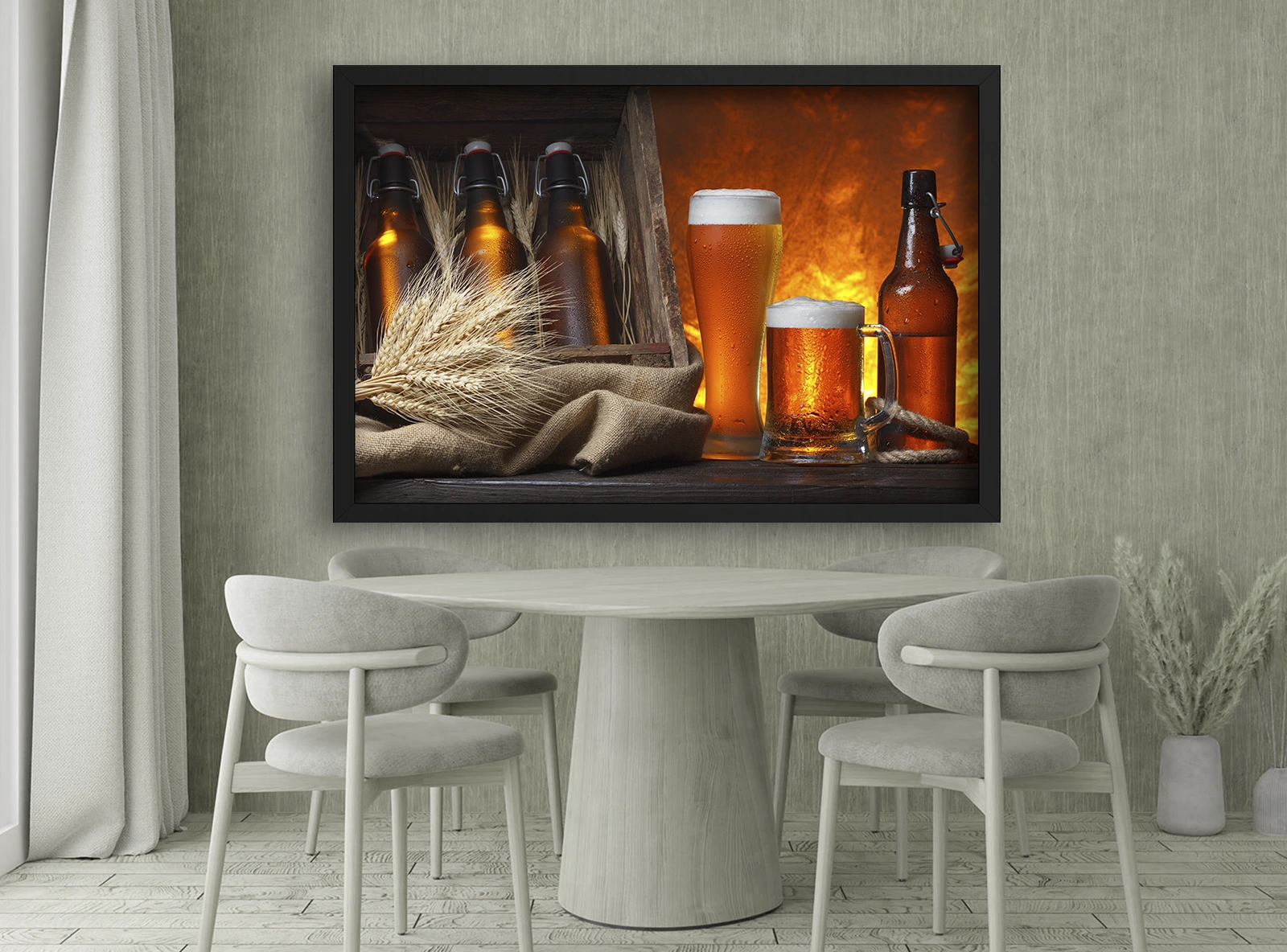 Un tablou bere impresionant cu bere în halbe și sticle de bere, alături de spice de orz decor, pe un fundal cald și primitor. Ideal pentru decor bucătărie modernă, al unui bar sau pub modern în stil decor rustic. Rama neagră oferă profunzime și scoate în evidență nuanțele calde ale imaginii.