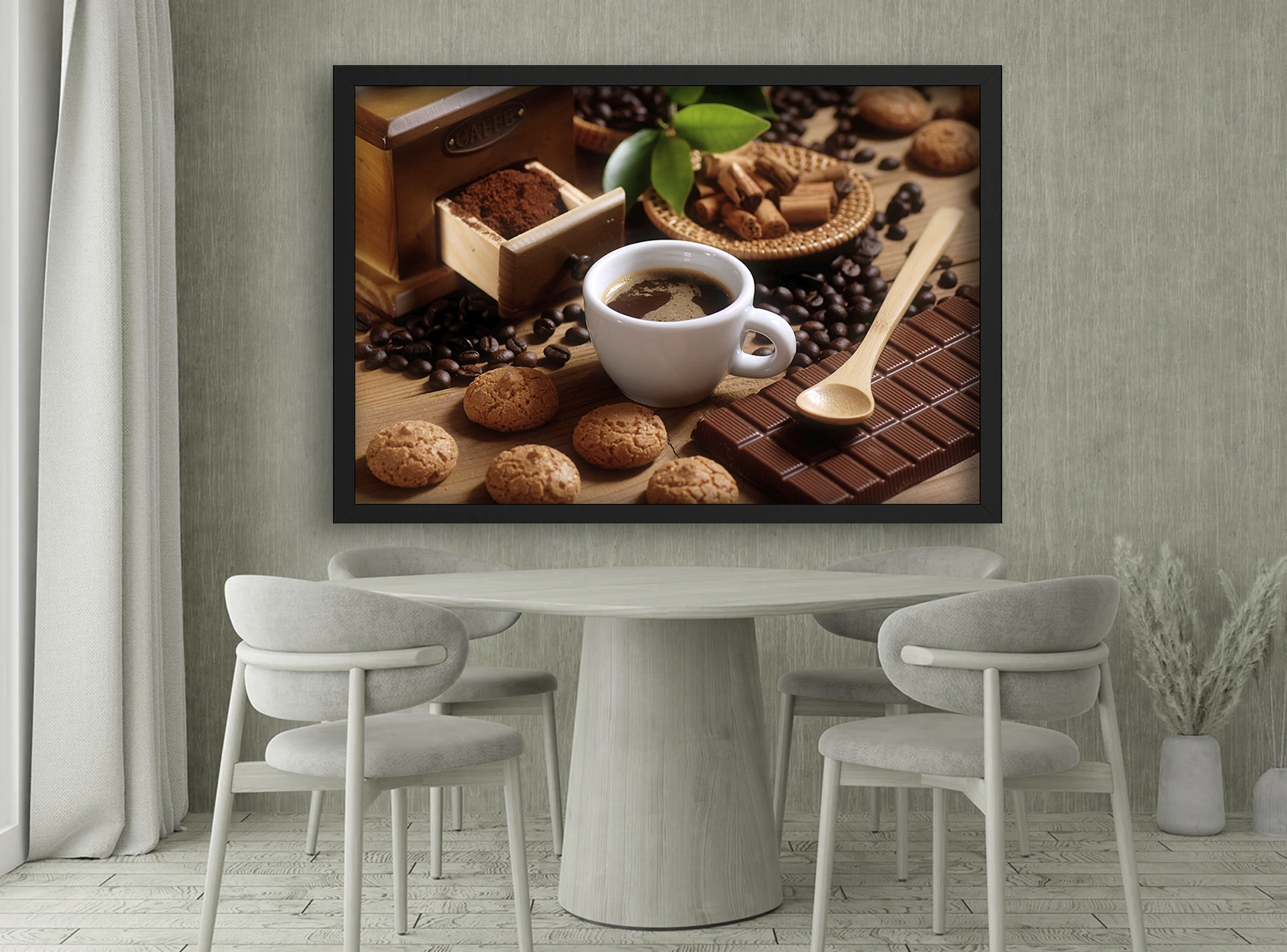 Un tablou în ramă neagră nu doar că oferă un contrast elegant, dar și completează orice temă de design interior. Dacă sunteți proprietarul unui coffee shop, considerați tablouri pentru coffee shop care să atragă privirile clienților și să creeze o atmosferă primitoare, îmbogățită cu decor cu prăjituri și alte elemente delicioase.