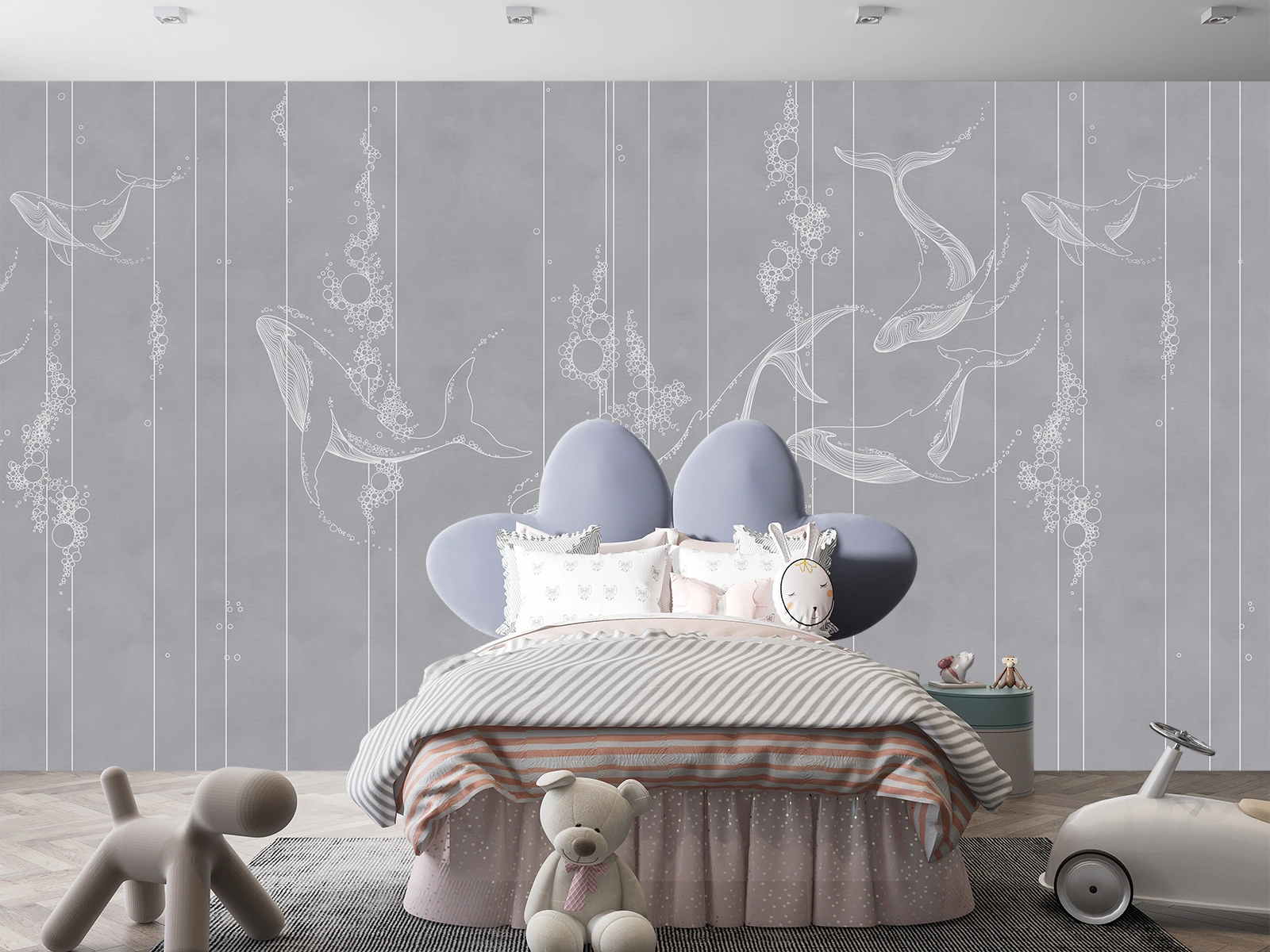 Fototapet „Balene sub apă” aduce o notă de liniște și rafinament în camera copiilor. Siluetele albe ale balenelor, desenate delicat pe fundal gri, oferă senzația de profunzime și visare. Perfect pentru un decor modern și calm, plin de inspirație marină.