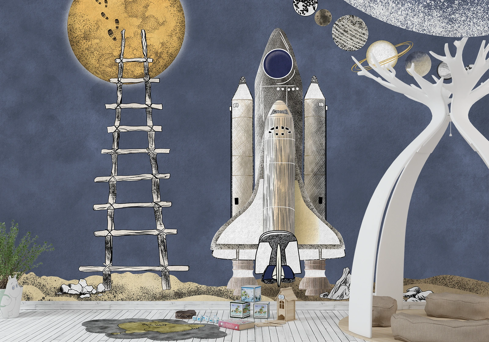 Fototapet „Rachetă spre lună” transformă camera copiilor într-un univers al viselor. Cu o rachetă pregătită de zbor și o scară care duce spre lună, designul inspiră curaj, curiozitate și dorință de descoperire. Perfect pentru micii exploratori ai spațiului.
