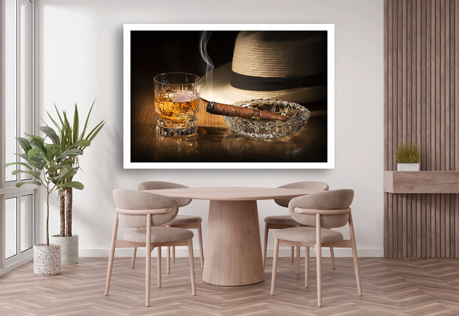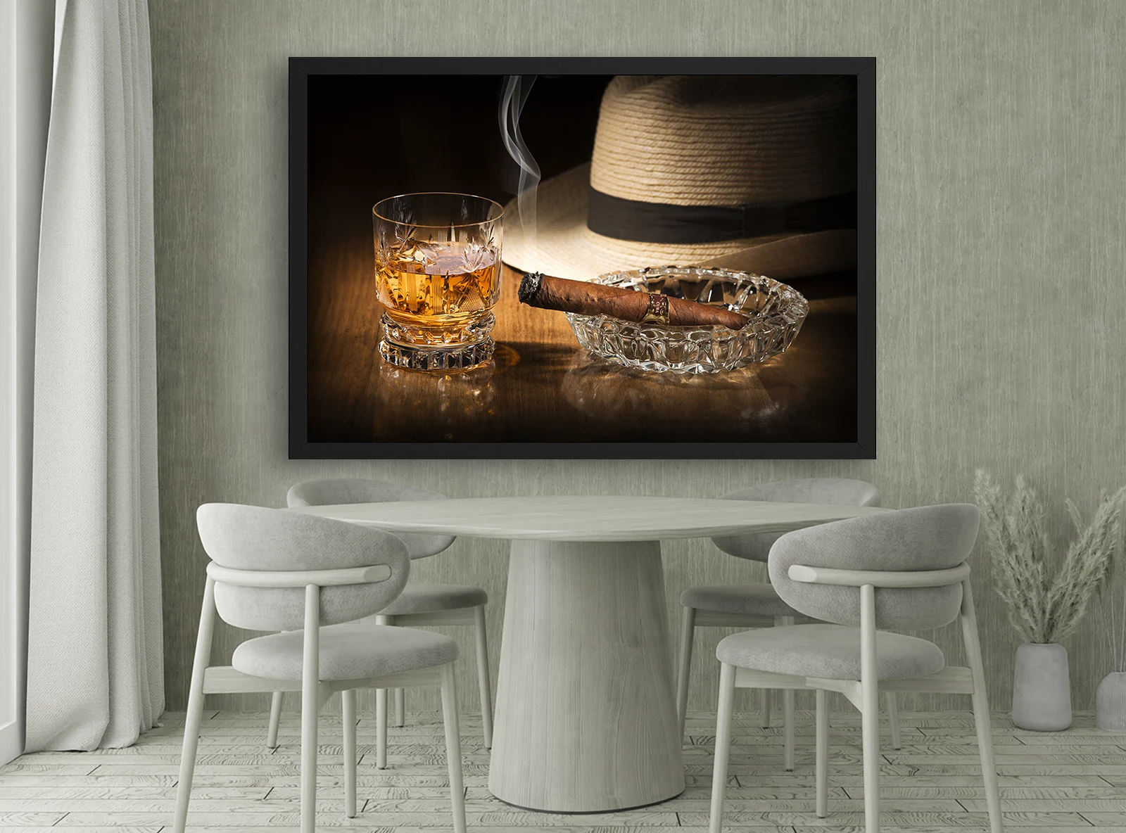 Tablou rafinat cu un pahar de whisky auriu, un trabuc aprins în scrumieră și o pălărie de paie – simboluri ale eleganței masculine. Ideal pentru decorul unui birou, club de gentlemeni sau bar tematic. Creează o atmosferă sofisticată și relaxantă.