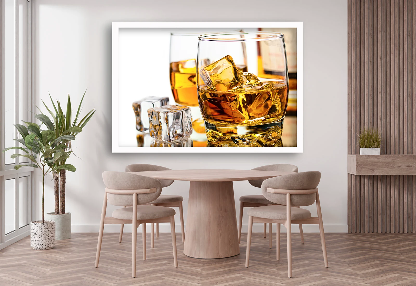 Un poster modern cu două pahare de whisky și cuburi de gheață, pe un fundal alb strălucitor. Tabloul creează un contrast vizual elegant, perfect pentru interioare sofisticate, baruri sau colțuri de relaxare cu gust.