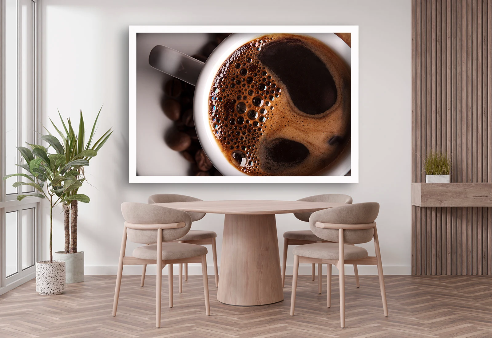 Un tablou captivant ce surprinde în detaliu o ceașcă de cafea neagră proaspăt preparată, cu spumă bogată și boabe de cafea în fundal. Ideal pentru decorul unei bucătării moderne sau a unei cafenele cu stil.
