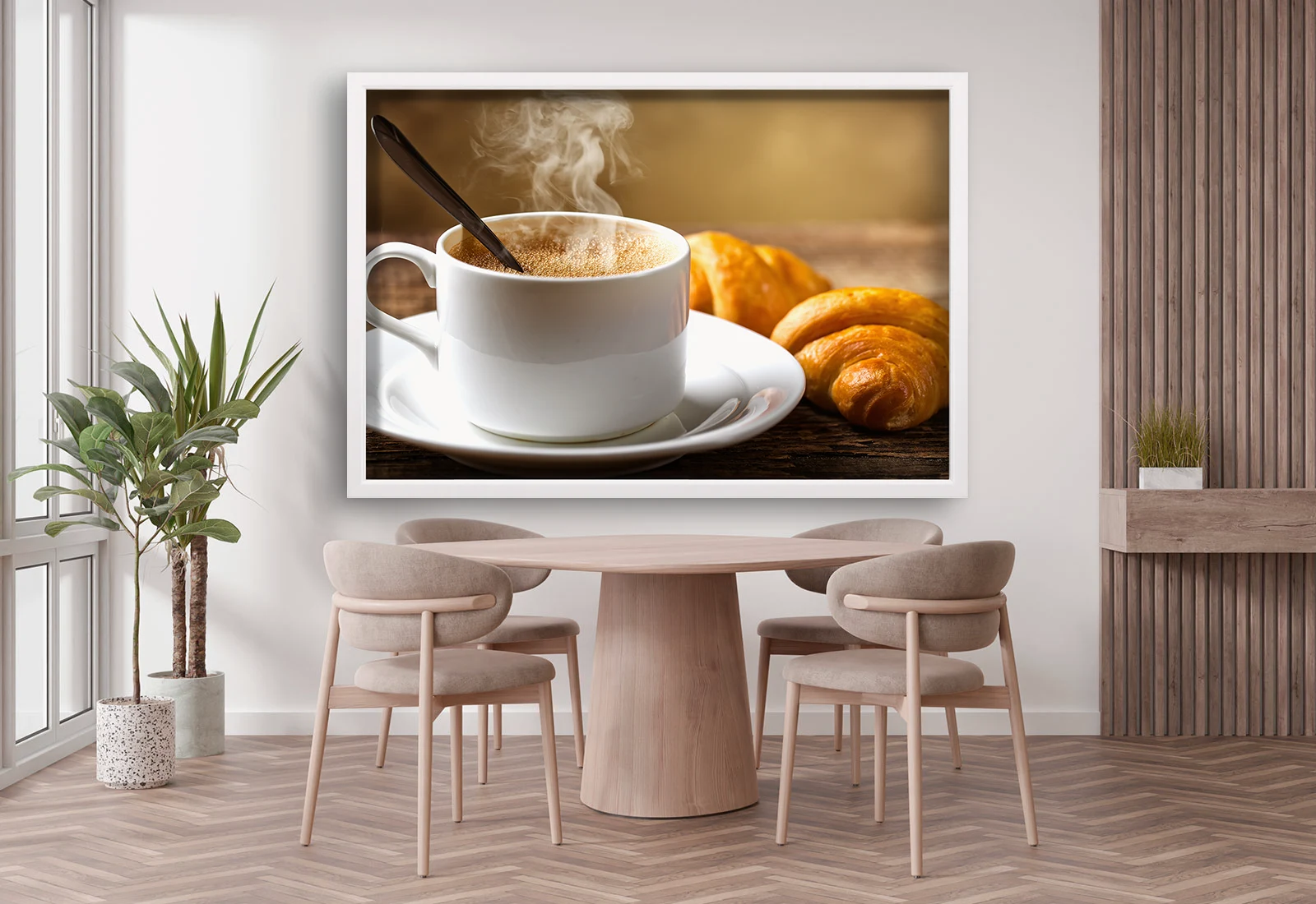 Acest tablou rafinat surprinde farmecul dimineților pline de aromă și prospețime. Ceasca albă de cafea aburindă și croissantele aurii evocă momentele liniștite ale micului dejun. Este perfect pentru bucătărie, cafenea sau restaurant, adăugând o notă caldă și primitoare spațiului. Rama neagră elegantă completează compoziția, oferind un contrast plăcut și o estetică modernă. Un tablou ce emană echilibru, confort și stil.