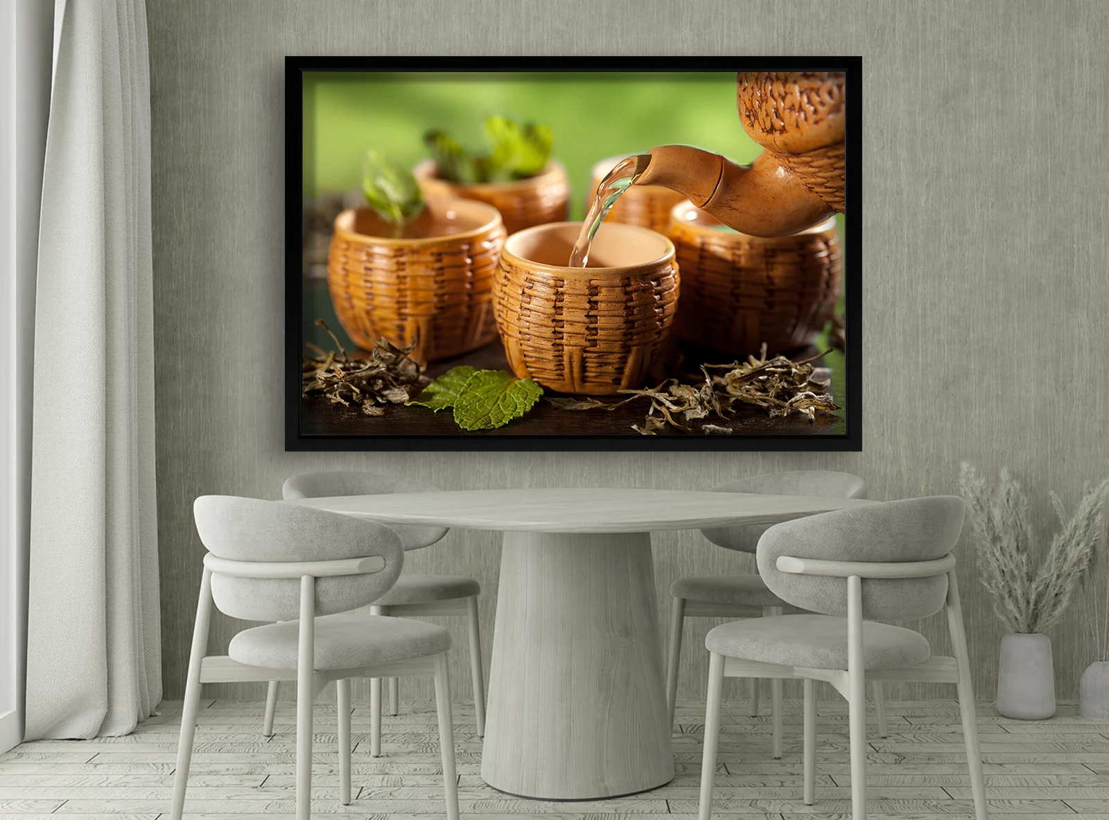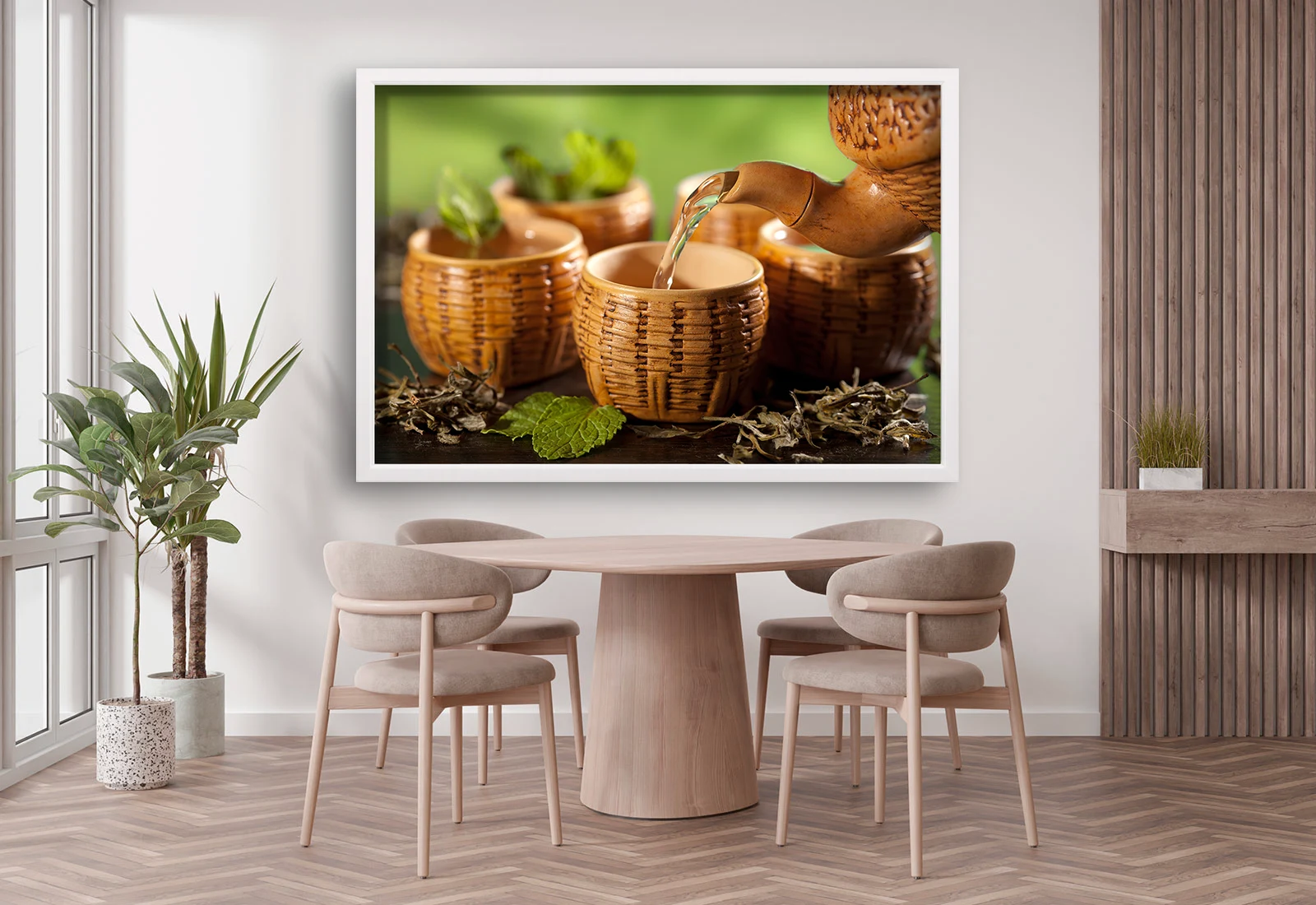 Acest tablou cald și echilibrat redă frumusețea ritualului ceaiului. Ceainicul toarnă băutura aromată în cești de lut, creând o atmosferă de liniște și relaxare. Este ideal pentru bucătării, cafenele sau spații de relaxare, aducând o notă naturală și plină de armonie. Rama albă oferă prospețime imaginii, transformând tabloul într-o piesă decorativă rafinată pentru orice interior modern sau rustic.