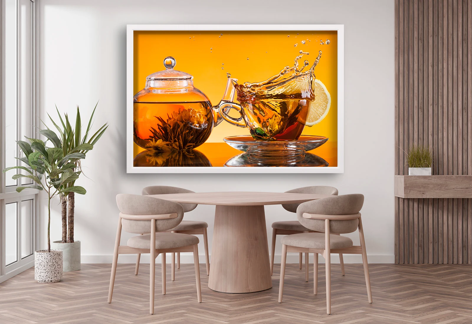 Acest tablou plin de culoare și energie aduce în interior o atmosferă veselă și revigorantă. Ceaiul aromat cu lămâie surprins în mișcare, pe un fundal galben intens, simbolizează prospețimea și vitalitatea. Este ideal pentru bucătărie, cafenea sau salon de ceai, adăugând un accent luminos și elegant decorului. Rama albă conferă tabloului finețe și modernitate, făcându-l potrivit pentru orice spațiu contemporan.