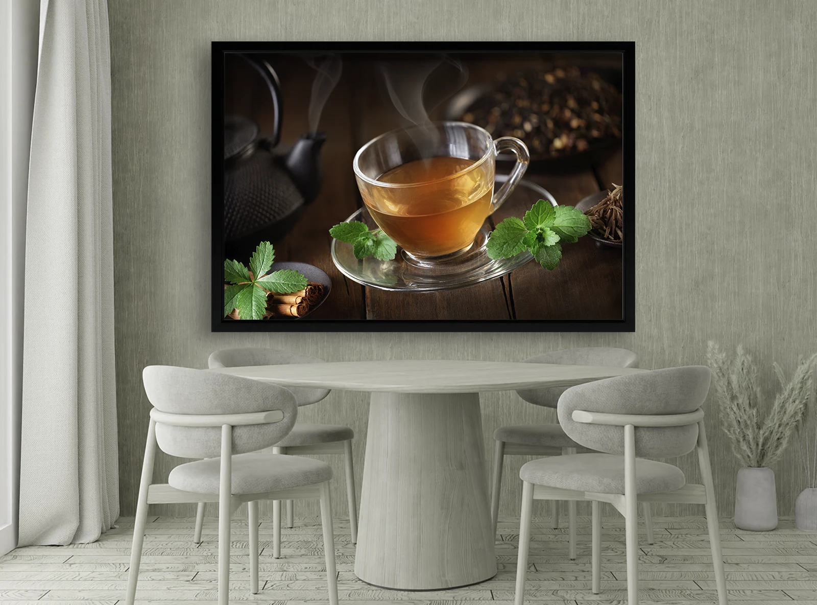 Acest tablou elegant surprinde atmosfera calmă a unui moment de relaxare cu o ceașcă de ceai aromat. aburul fin, frunzele de mentă și tonurile calde de lemn creează o compoziție rafinată și liniștitoare. Este ideal pentru bucătărie, cafenea sau un colț de relaxare acasă, adăugând decorului o notă naturală și sofisticată. Rama neagră oferă contrast și profunzime, scoțând în evidență finețea detaliilor.