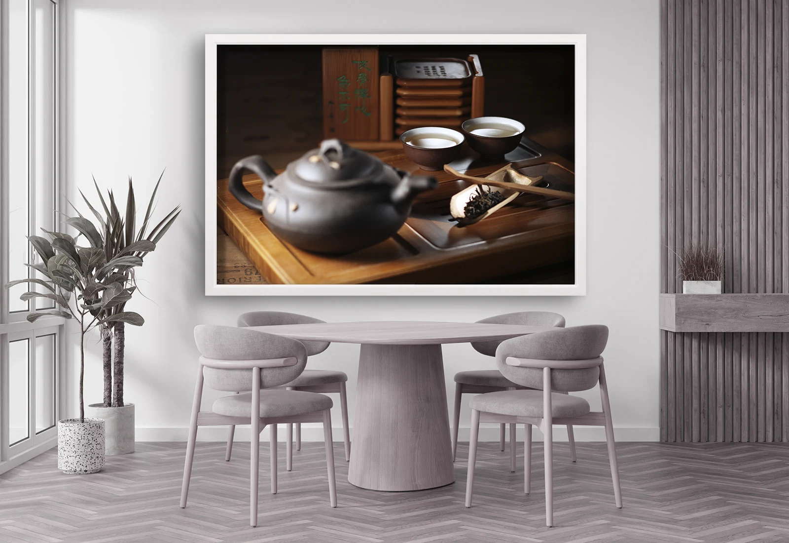 Tabloul „Ceremonia ceaiului” surprinde frumusețea calmă a unei tradiții asiatice. Ceainicul și ceștile din ceramică, așezate pe o tavă din bambus, redau eleganța și echilibrul ritualului ceaiului. Lumina caldă și compoziția echilibrată oferă un sentiment de liniște și rafinament. Rama neagră accentuează profunzimea imaginii, făcând-o potrivită pentru bucătării, cafenele sau colțuri dedicate relaxării și meditației.