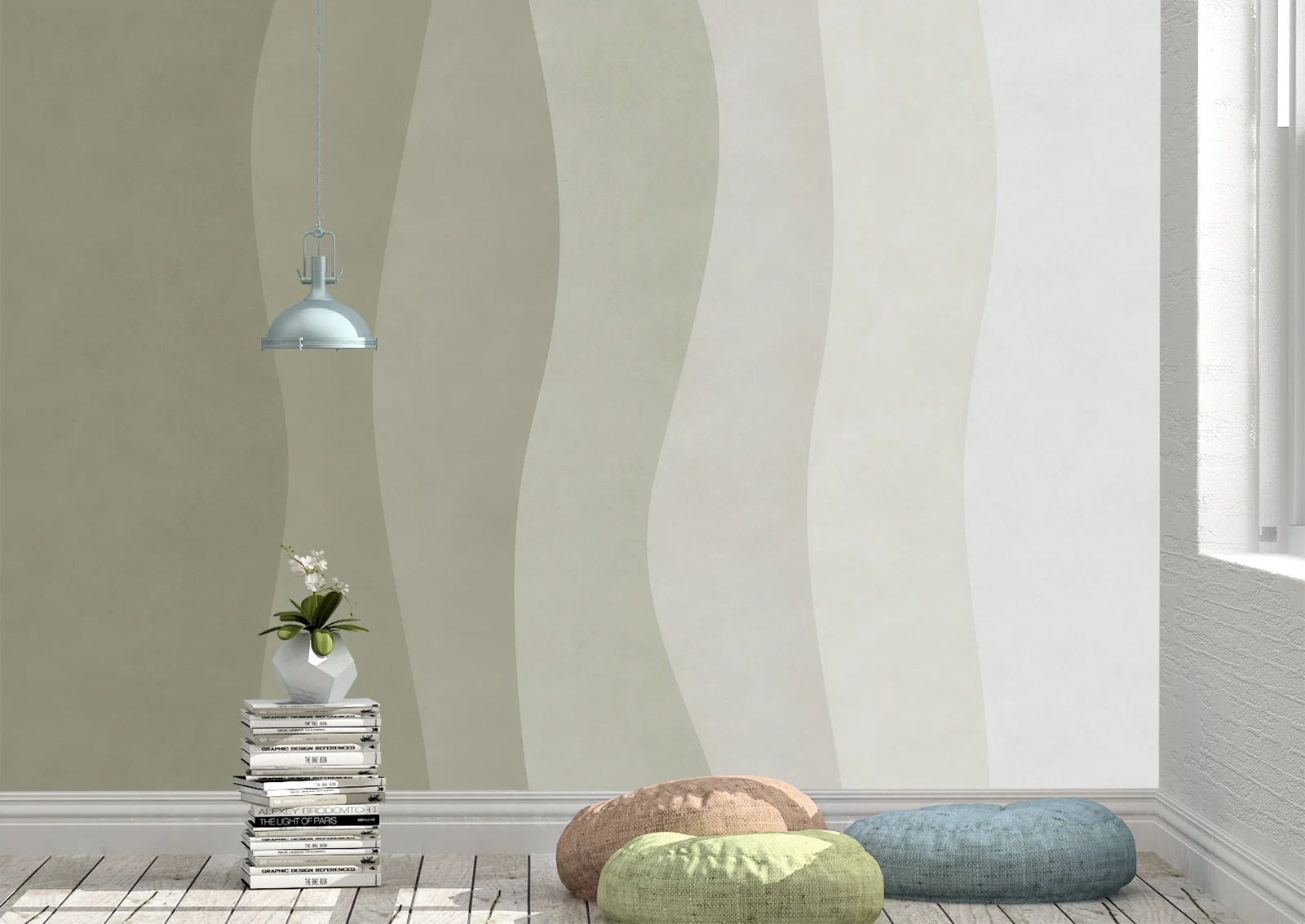Acest fototapet aduce o atmosferă calmă și luminoasă prin liniile sale ondulate și nuanțele pastelate inspirate din natură. Tranzițiile line dintre culori creează o suprafață plăcută și armonioasă, care oferă pereților profunzime și delicatețe. Designul minimalist îl transformă într-o alegere ideală pentru spațiile în care se dorește un decor discret, elegant și relaxant. În living, fototapetul devine un fundal perfect pentru mobilier modern, conferind camerei o senzație de deschidere și continuitate vizuală.