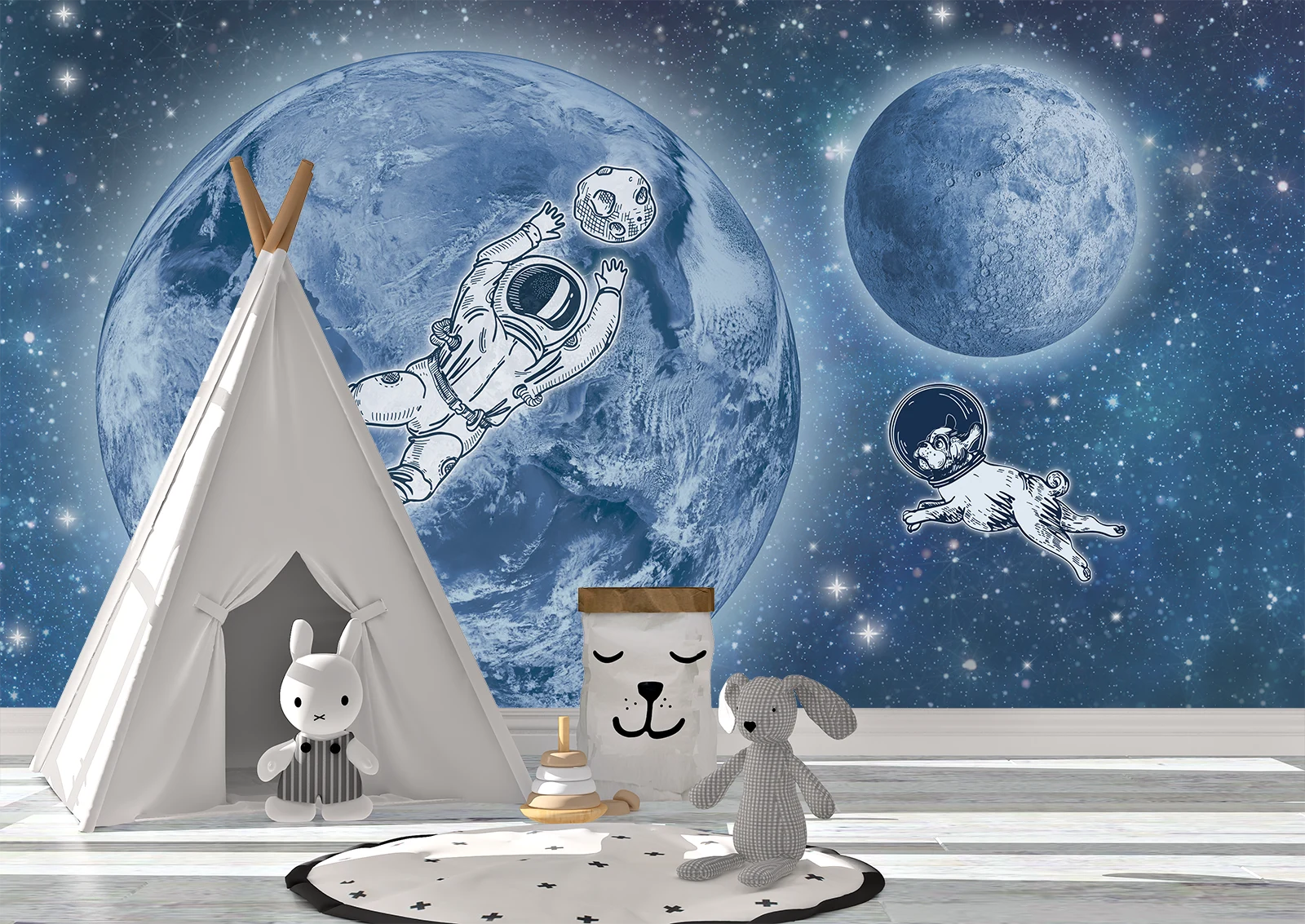 Acest fototapet transformă camera copilului într-un univers plin de magie și aventură. Pe fundalul cerului înstelat apar două planete mari și personaje simpatice — un astronaut desenat și un cățeluș în costum spațial, plutiți în imponderabilitate. Designul transmite veselie și imaginație, invitând copilul să creeze propriile povești despre explorarea spațiului.