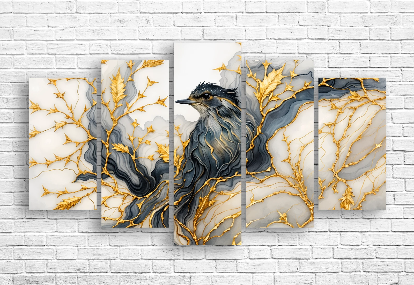 ✅ Tablou modular cu pasăre așezată pe ramuri aurii. ✓ Imprimare foto pe pânză în Chișinău. 🚚 Livrare în Chișinău și Moldova. ⭐Tablouri cu păsări - Art-Design.