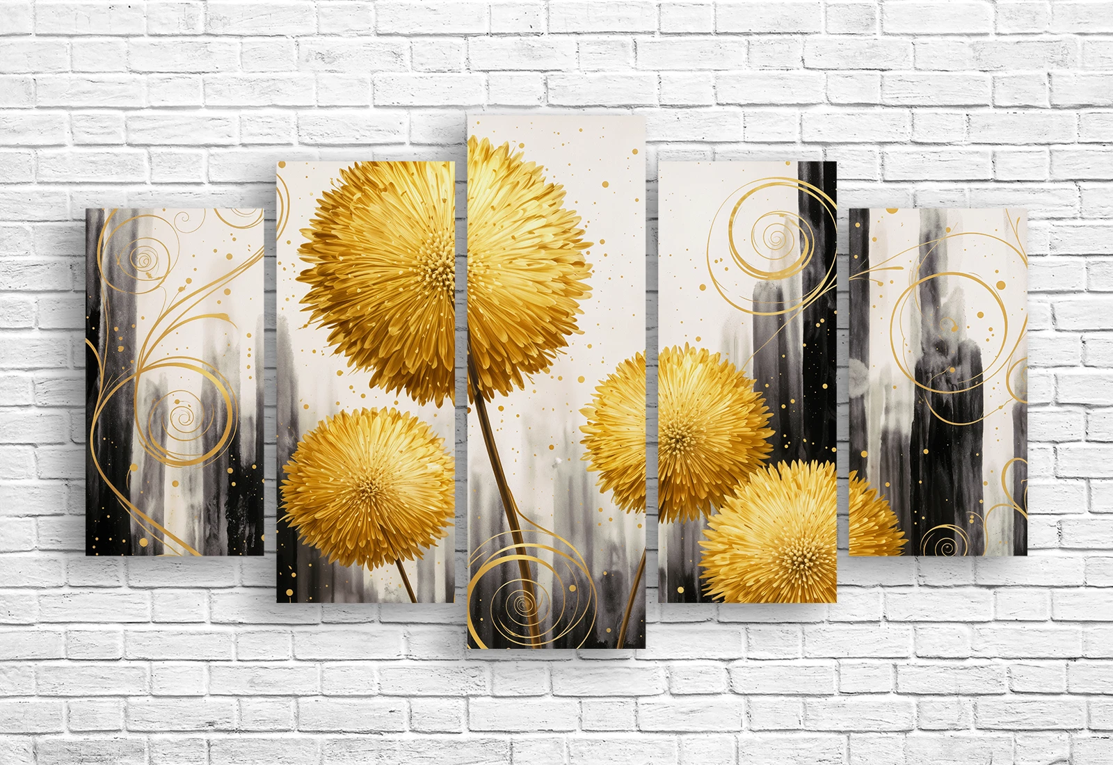 Tabloul modular «Păpădii aurii, abstracție» întruchipează jocul luminii și formei, unde imaginile recognoscibile ale păpădiilor se împletesc cu elemente abstracte.