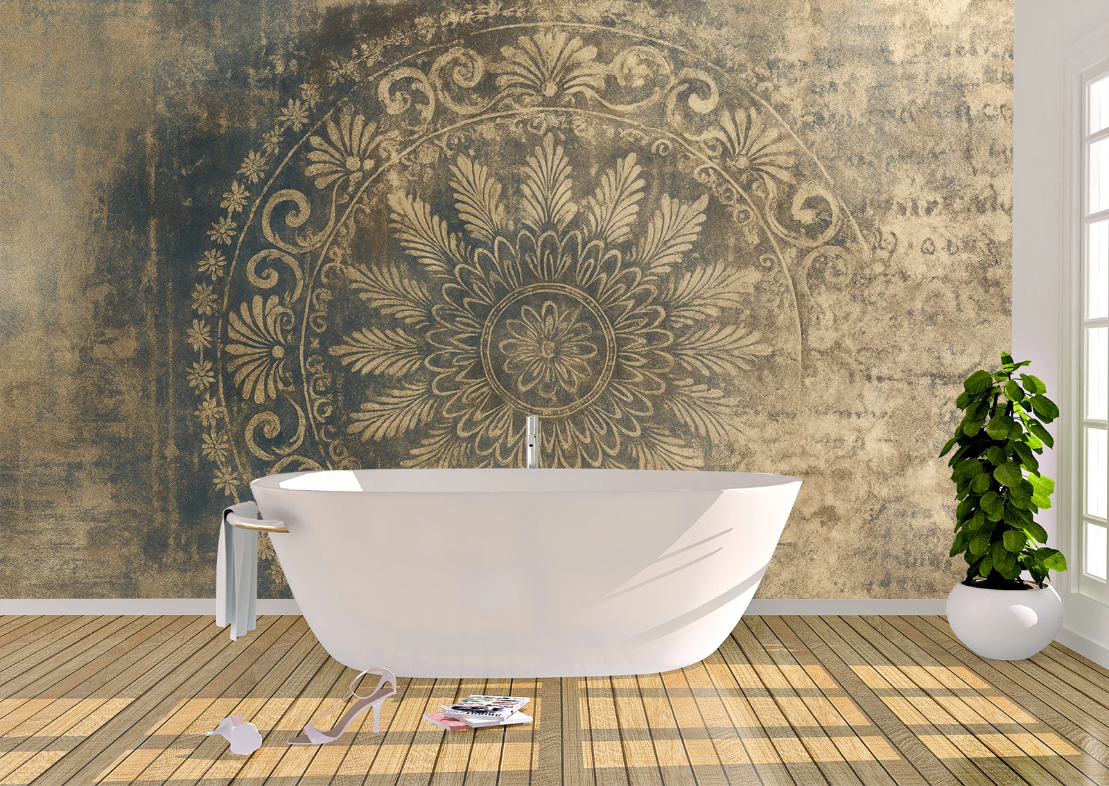 Nuanțele calde de bej și accentele aurii creează o atmosferă plăcută și relaxantă, potrivită pentru baie, dormitor sau living. Designul se integrează ușor în interioare elegante sau moderne, devenind punctul principal de atracție.