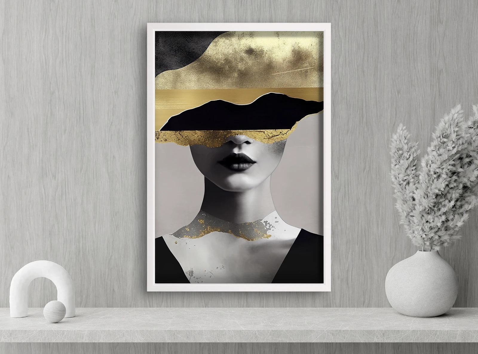 Acest tablou combină un portret feminin expresiv cu elemente de abstracție aurie, creând o compoziție modernă și sofisticată. Contrastul dintre tonurile alb-negru și accentele aurii oferă profunzime și eleganță vizuală. Linia abstractă care acoperă zona ochilor adaugă mister și originalitate.