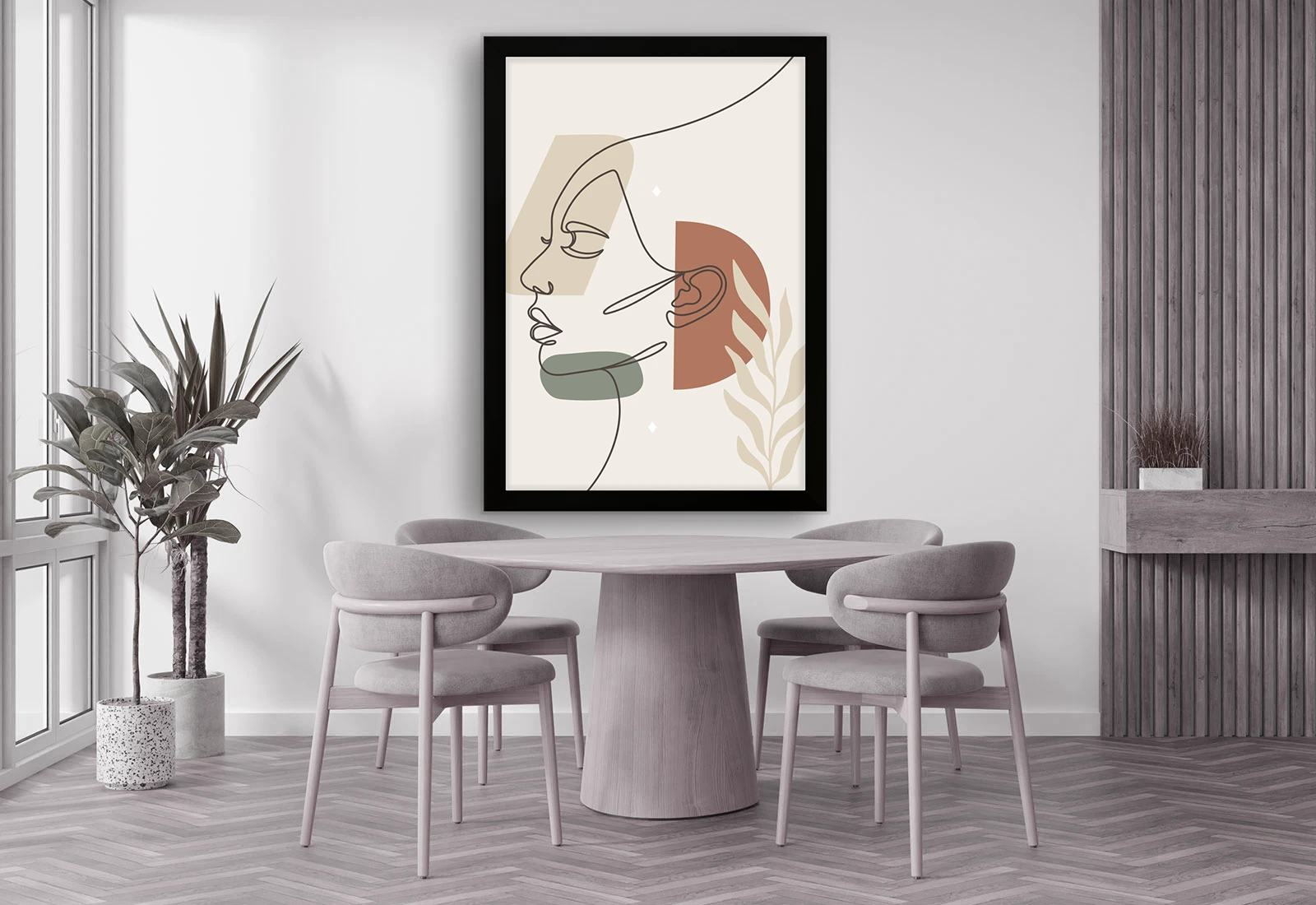 Acest tablou minimalist prezintă un profil de față realizat dintr-o linie continuă, combinat cu forme abstracte și nuanțe naturale. Designul simplu, dar expresiv, creează o compoziție echilibrată și modernă.