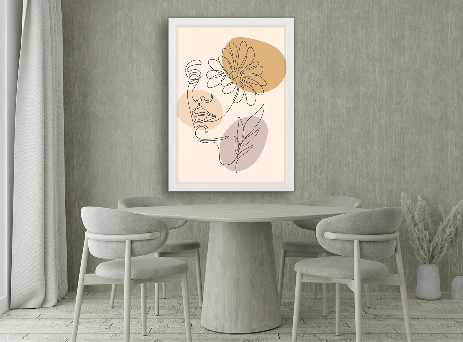 Acest tablou modern prezintă o față abstractă realizată dintr-o linie continuă, completată de un element floral elegant. Designul minimalist combină forme simple cu nuanțe pastelate, creând o compoziție echilibrată și armonioasă.