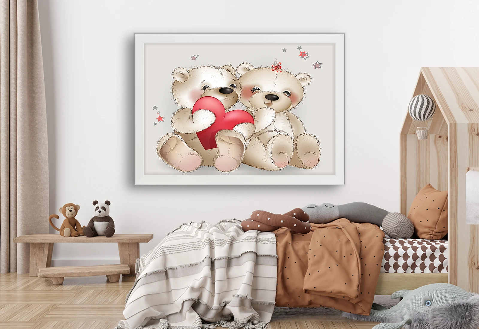 Rama albă completează armonios imaginea, oferind un aspect curat și elegant. Ideal pentru dormitor sau zona de joacă, acest tablou adaugă un plus de tandrețe și veselie în orice interior.