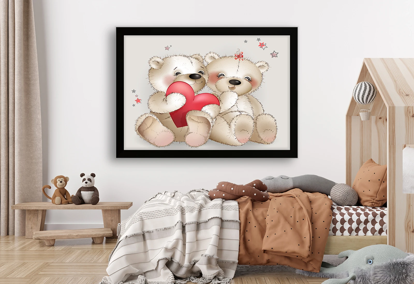 Acest tablou adorabil prezintă doi ursuleți pufoși care țin o inimă roșie, simbol al iubirii și grijii. Culorile delicate și stilul prietenos creează o atmosferă caldă și liniștitoare în camera copilului. Designul este perfect pentru a aduce bucurie și confort în spațiul celor mici.