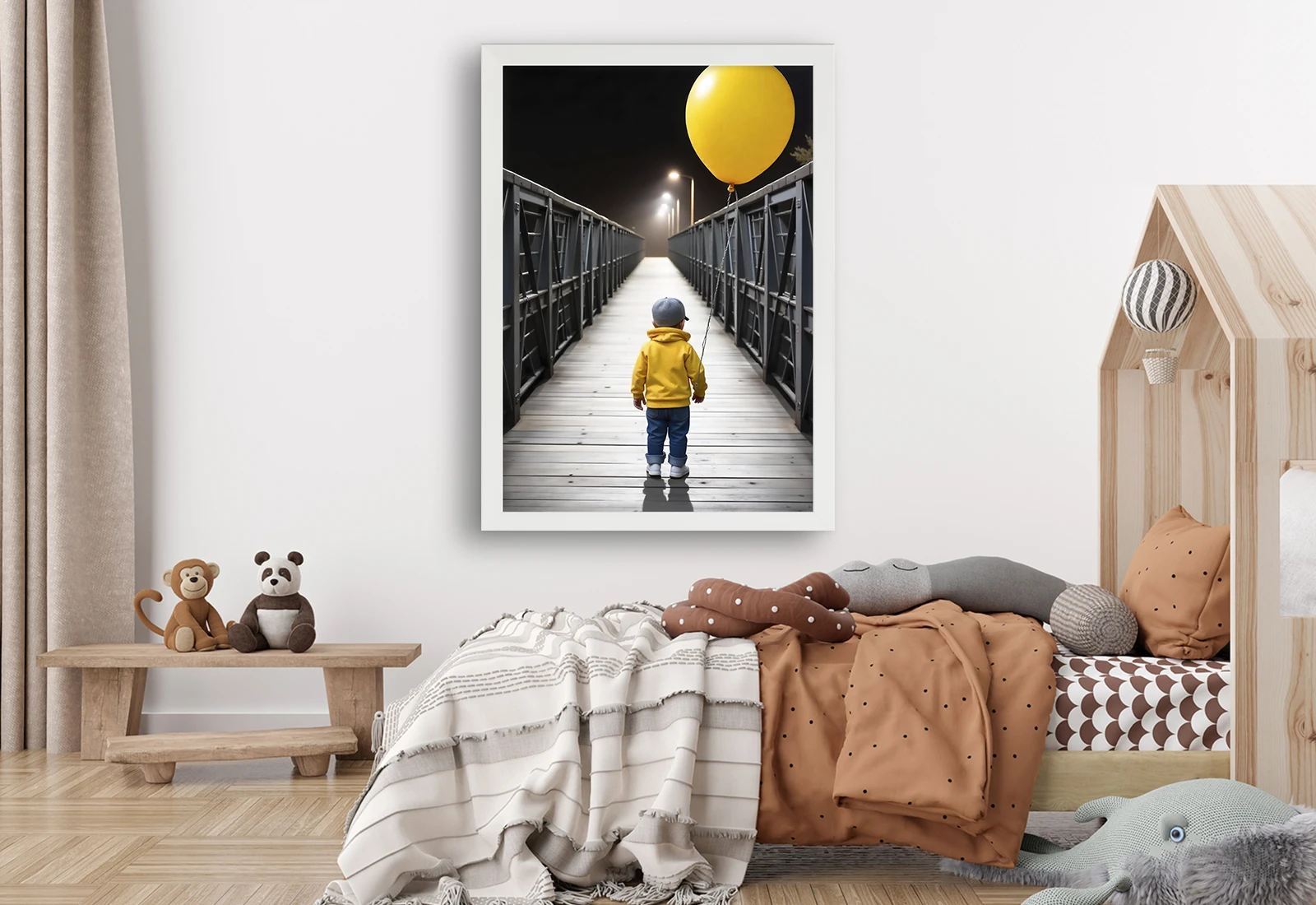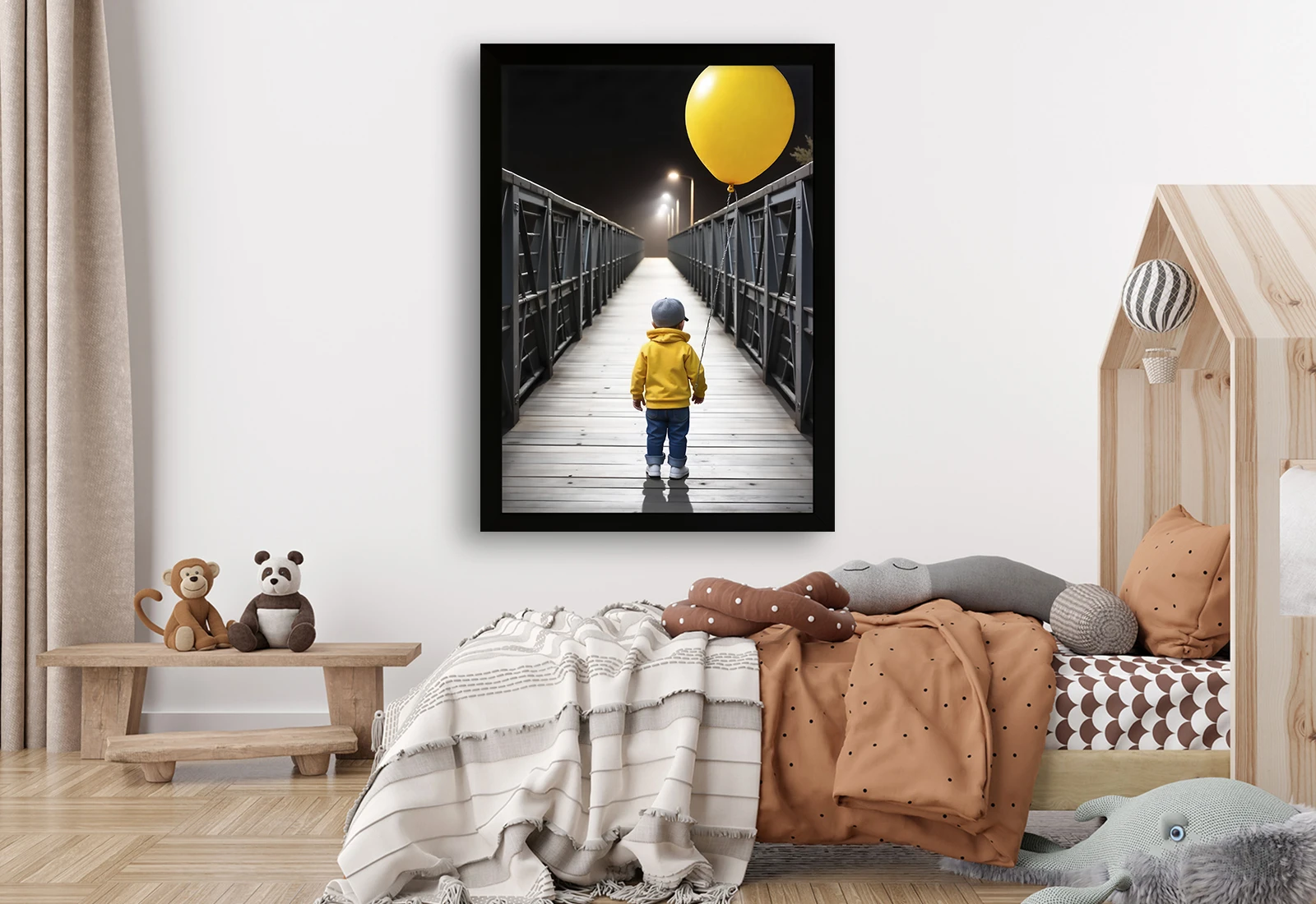 Am creat această imagine ca o poveste vizuală despre drum și speranță. Copilul merge singur pe pod, iar balonul galben devine un simbol al viselor și luminii interioare.