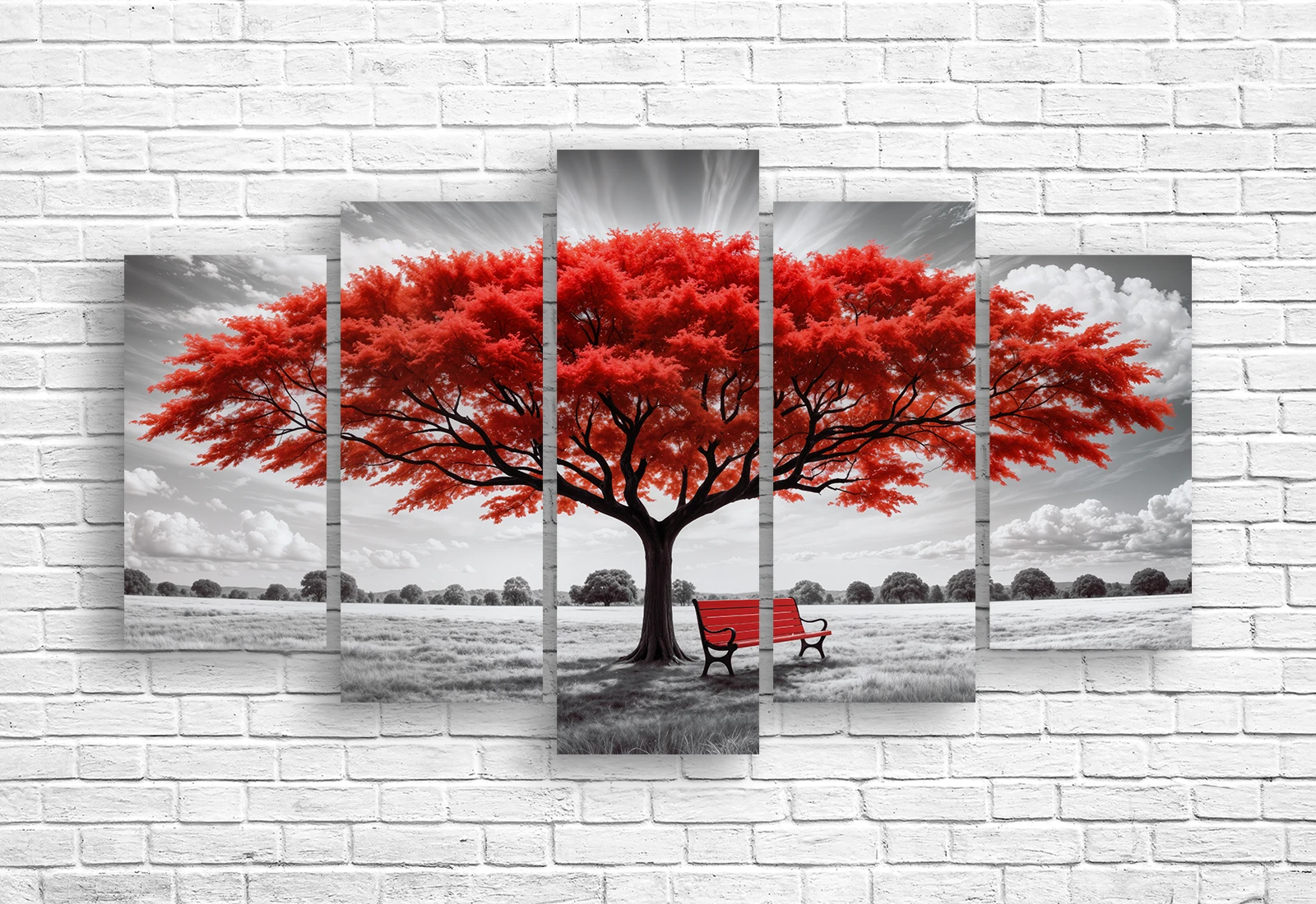 Tablou modular „Copac roșu și bancă” impresionează prin contrastul dintre culoarea intensă a copacului și fundalul monocrom. Copacul roșu devine elementul central, simbolizând energie și viață, iar banca adaugă o notă de liniște și reflecție.