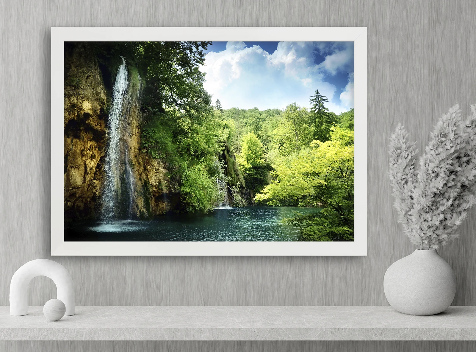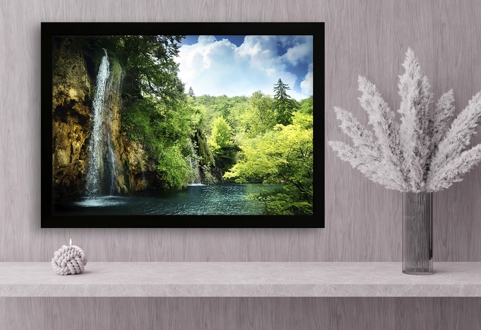 Am ales această scenă pentru a reda liniștea și prospețimea naturii. Cascada curge lin peste stâncă în apa limpede a lacului, înconjurată de verde intens. Este un tablou care aduce echilibru și relaxare în interior, ca o fereastră deschisă către natură.