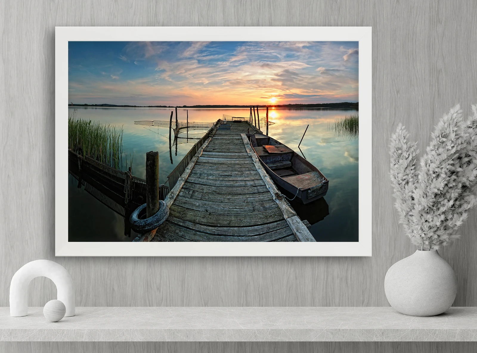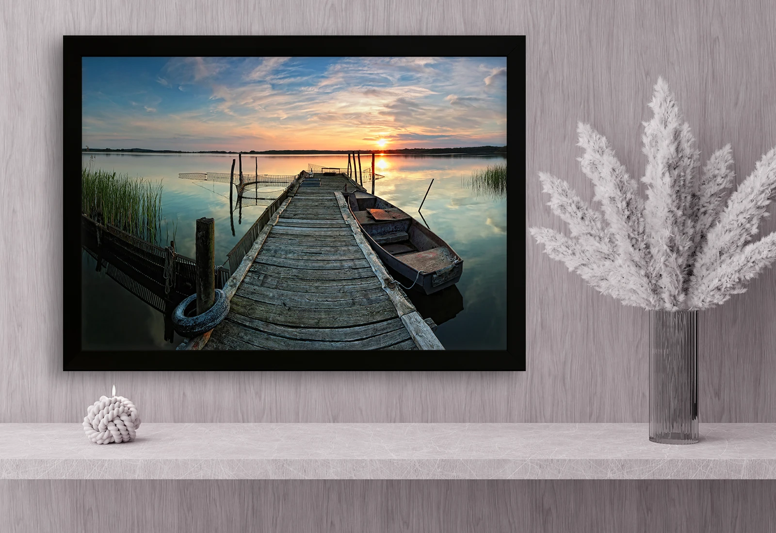 ✅ Tablouri cu ramă Chișinău cu ponton și lac liniștit la apus. ✓ Reflexii în apă, lumină caldă și peisaj natural relaxant. 🚚 Livrarea. ⭐ Art-Design.md.