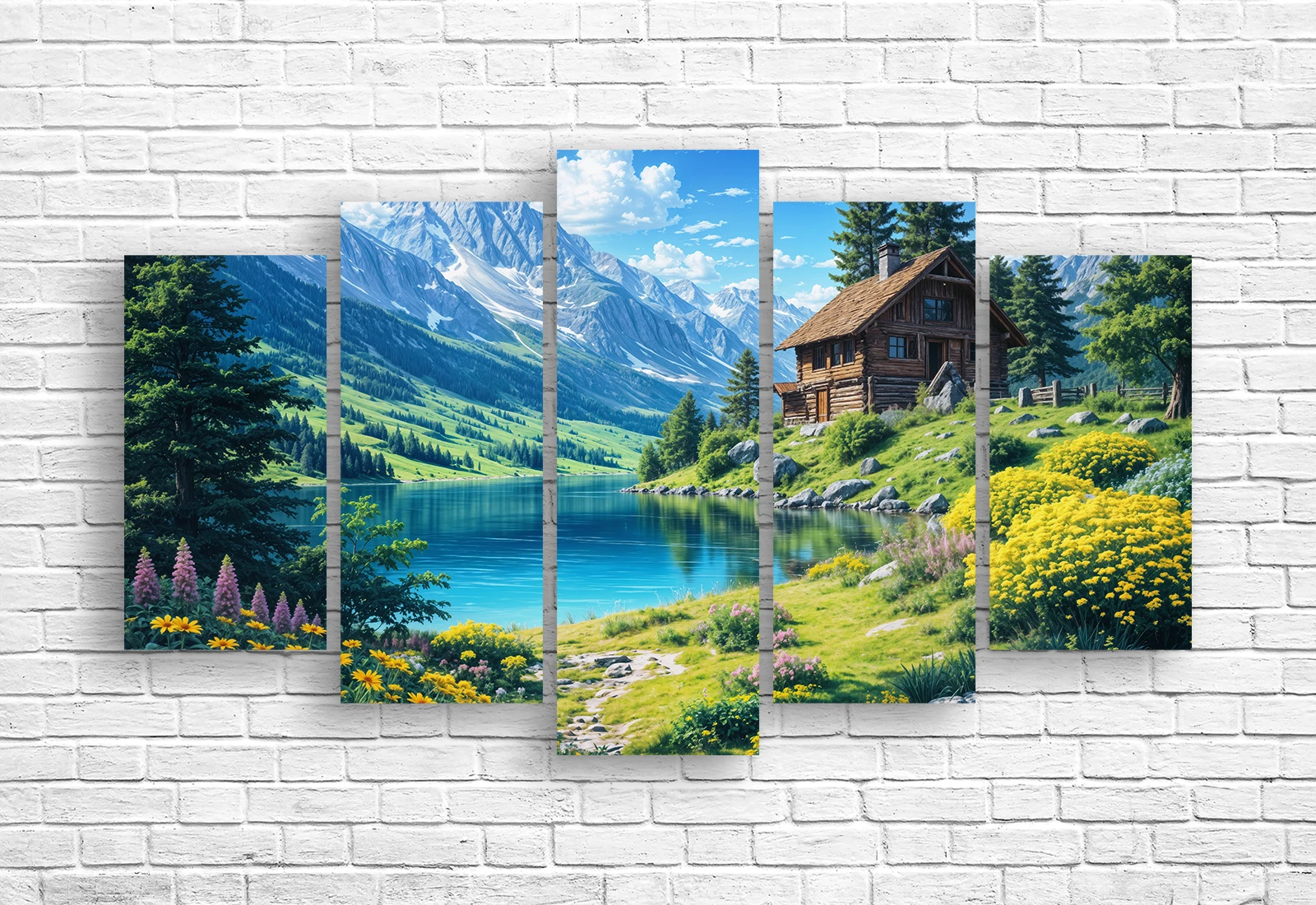 Acest tablou modular inspirat, compus din cinci piese, vă transpune în atmosfera liniștită a munților Alpi. Pe pânză este reprezentată o cabană primitoare din lemn, situată pe o coastă verde înflorită, lângă un lac cu ape turcoaz cristaline.