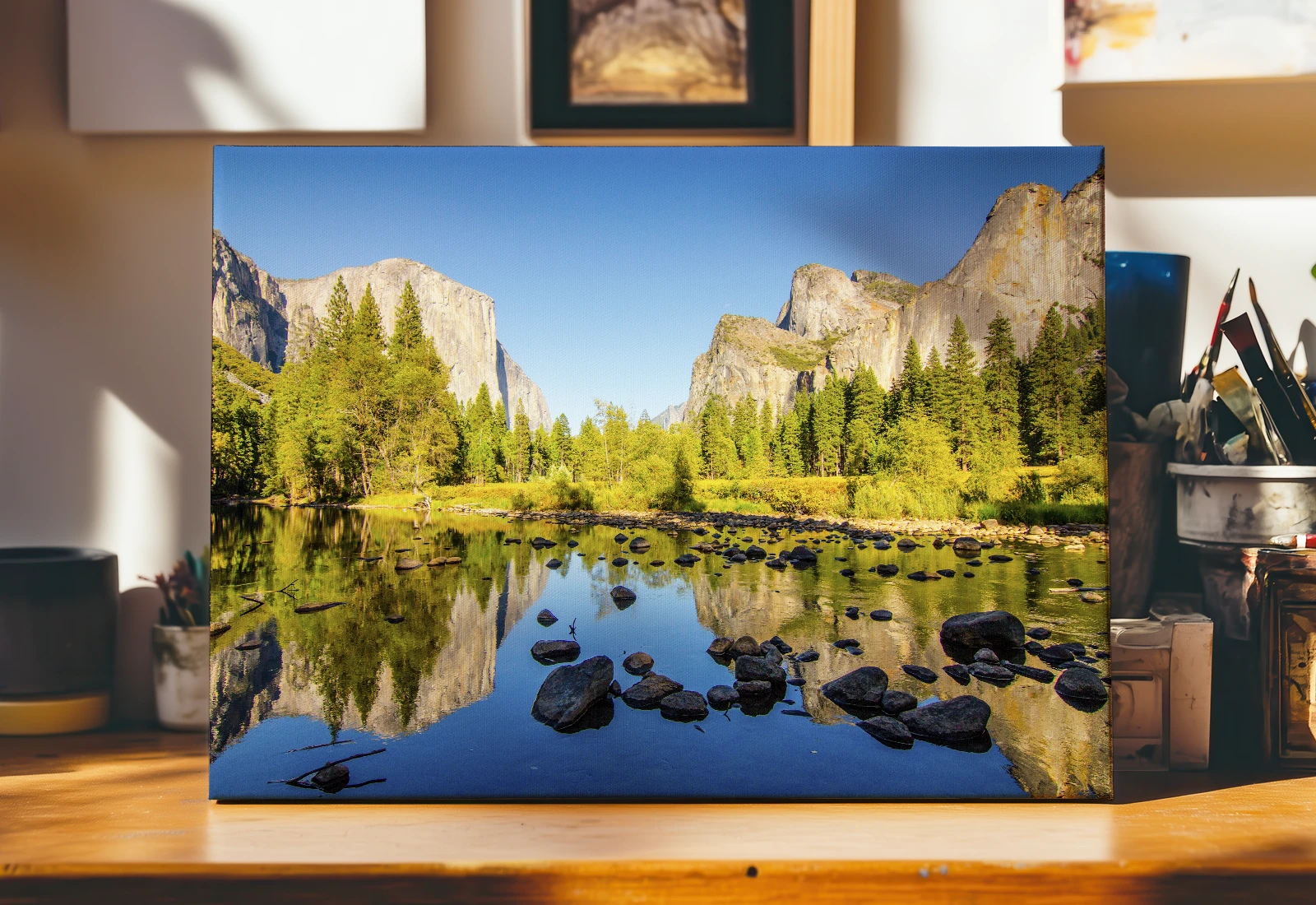 Privind acest tablou, mă simt transportat instantaneu în inima Parcului Național Yosemite. În fața mea se deschide o panoramă maiestuoasă: stâncile monumentale de granit El Capitan și Half Dome se înalță deasupra văii scăldate în lumina puternică a soarelui.