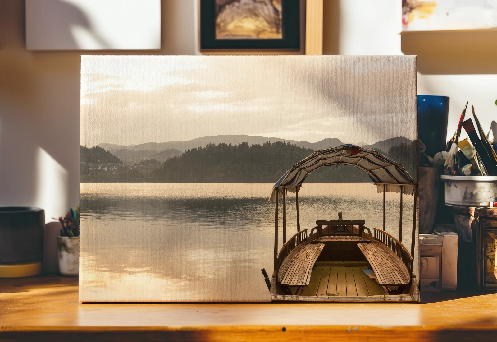 ✅ Vedere liniștitoare spre lac și munți pe pânză. ✓ Lumină moale și gamă cromatică caldă de sepia. 🚚 Livrare în Moldova. ⭐ tablouri pe panza - Art-Design.md