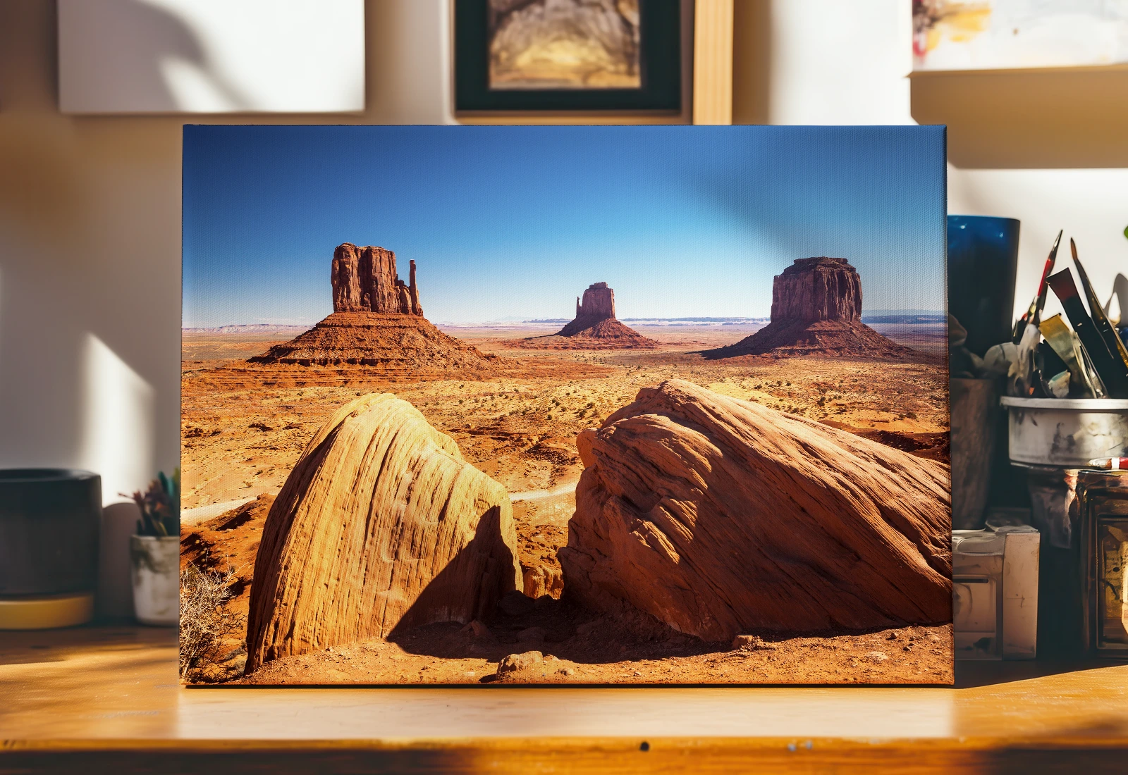 Privind această pânză, simt suflarea fierbinte a deșertului american. În fața mea se deschide o vedere legendară a Monument Valley: stânci monumentale din gresie roșie se înalță maiestuos deasupra câmpiei aride. În prim-plan sunt surprinși bolovani masivi cu o textură stratificată unică, care parcă ghidează privirea spre interiorul compoziției.