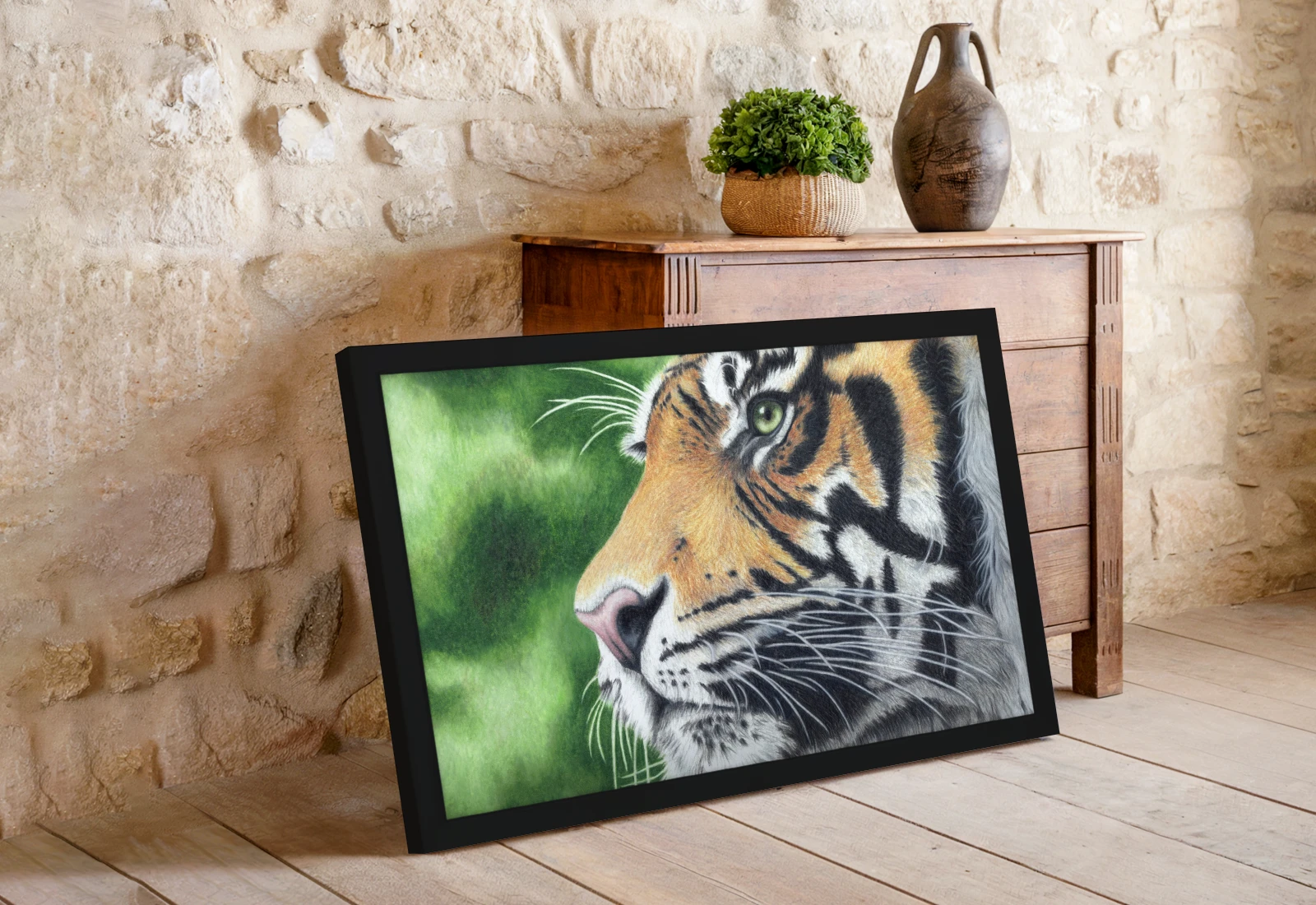 Îmi place modul în care privirea tigru transmite siguranță și concentrare. Această lucrare este potrivită pentru un interior unde se dorește un accent puternic și expresiv.