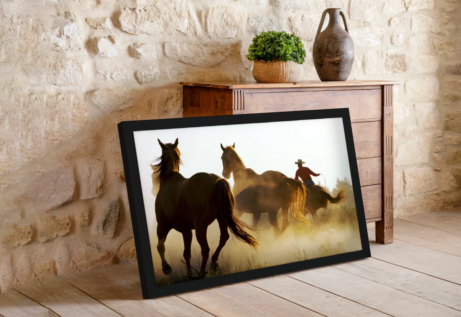 ✅ Tablou cu ramă cu cai la apus în mișcare, tablouri Chișinău. ✓ Imagine dinamică cu praf și lumină caldă. 🚚 Livrare în Chișinău și Moldova. ⭐ Art-Design.md