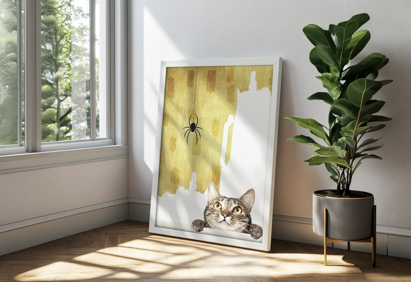 ✅ Tablou cu ramă cu pisică și păianjen, tablouri Chișinău. ✓ Imagine jucăușă cu reacție surprinsă și detalii expresive. 🚚 Livrare în Chișinău. ⭐ Art-Design.md