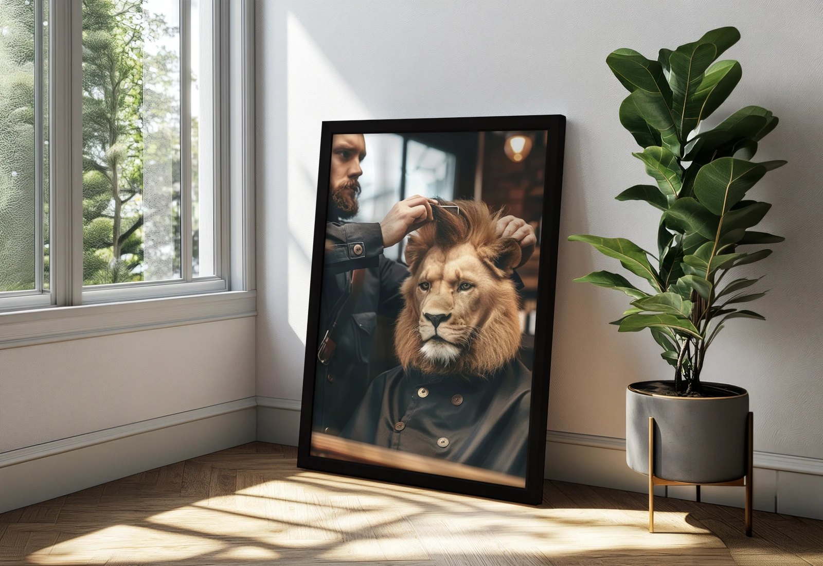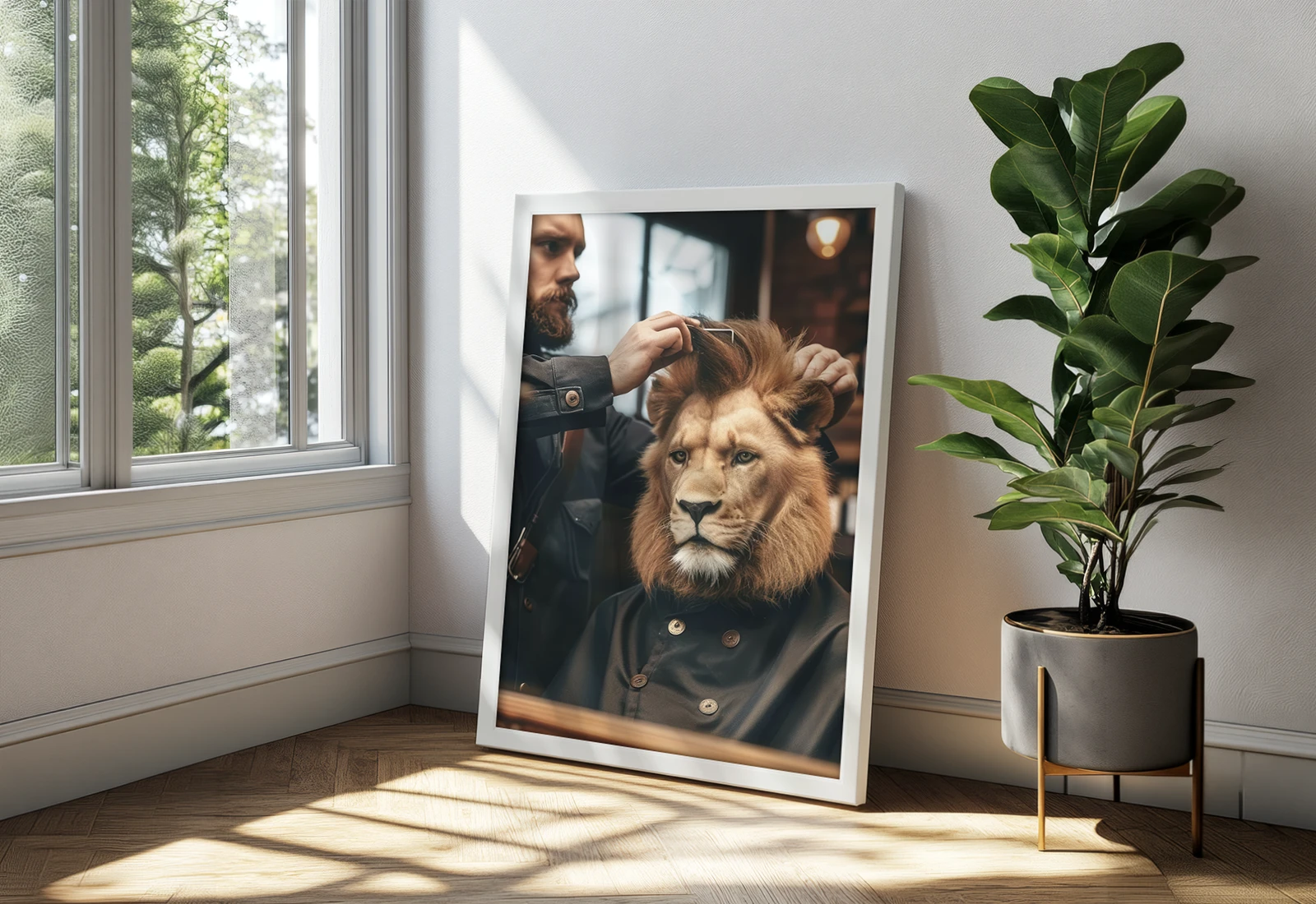 Am vrut să combin forța naturală cu eleganța urbană într-o singură imagine. Leul, aflat în scaunul de barber, transmite calm și siguranță, iar coama sa devine elementul central al compoziției.