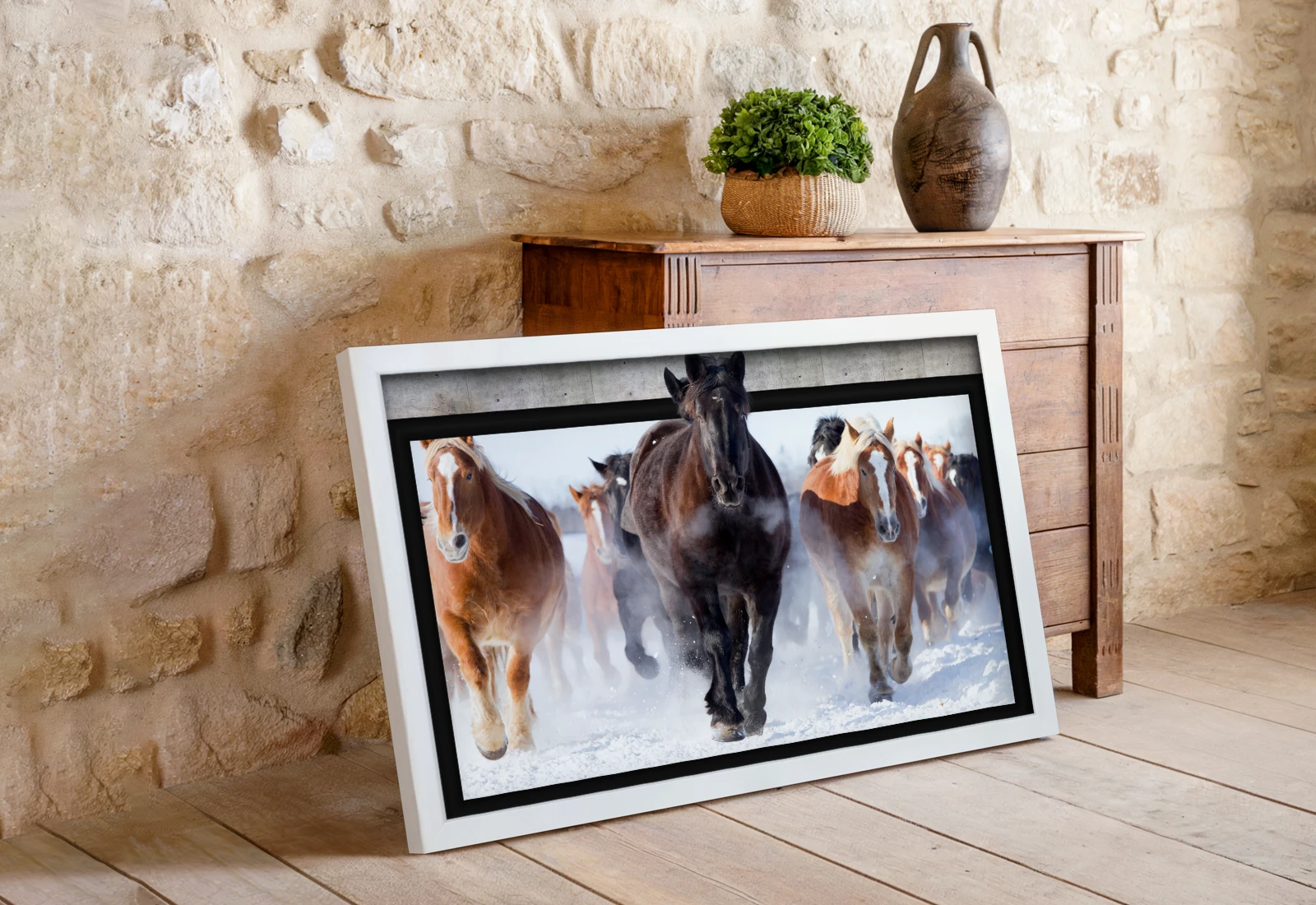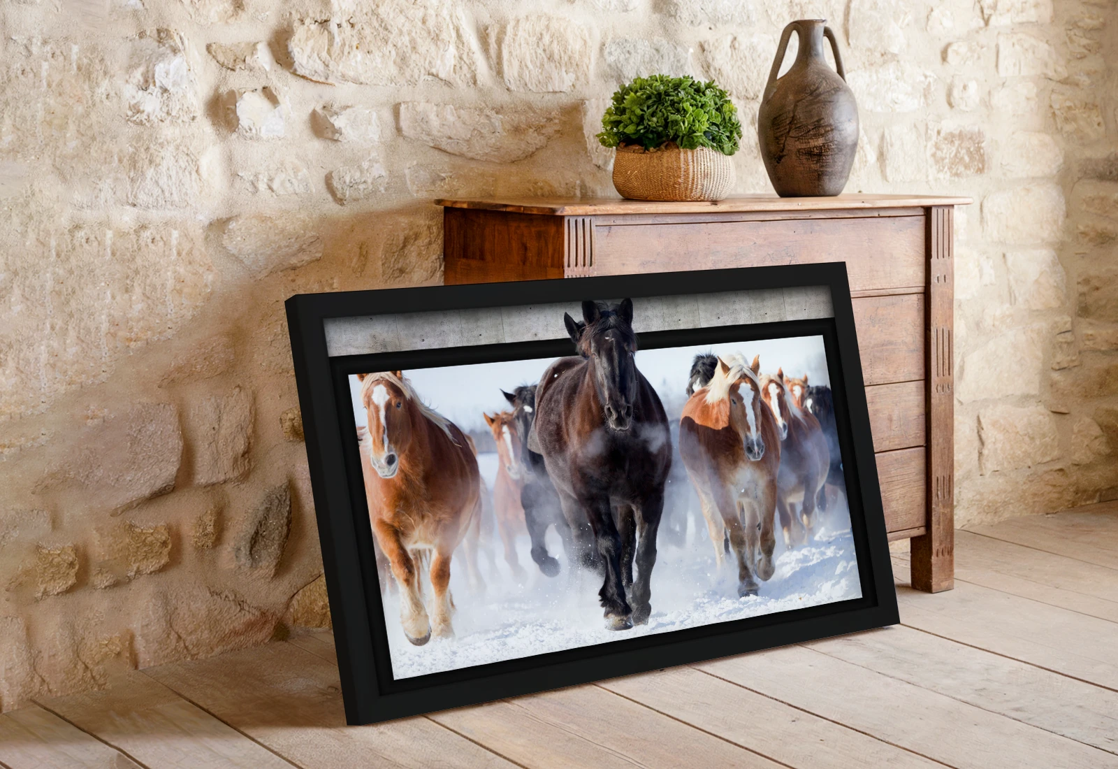 Calul din centru atrage privirea și oferă senzația de putere și control, iar restul compoziției completează armonios imaginea. Rama neagră accentuează contrastul și adaugă profunzime.