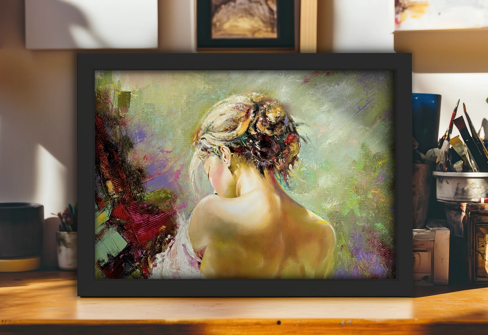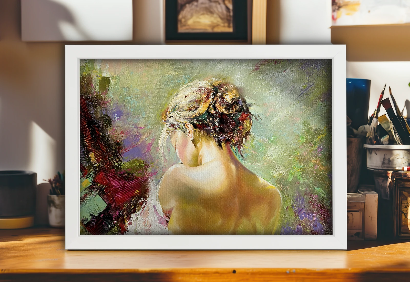 Tabloul este înrămat elegant într-o ramă albă, subliniind senzualitatea siluetei din spate. Datorită vopselelor latex ecologice, culorile rămân saturate și profunde.
