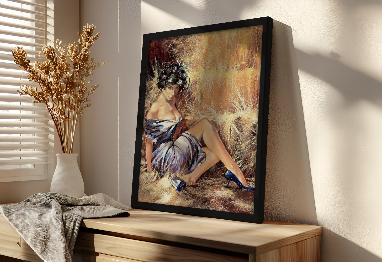 Privind această pânză, simt starea de spirit însorită și farmecul cochet al epocii retro. Este o imprimare latex de înaltă calitate pe pânză naturală, care imită cu măiestrie tehnica bogată a picturii în ulei cu tușe vii. Tabloul este înrămat elegant într-o ramă neagră, scoțând în evidență imaginea vibrantă și jucăușă a unei fete în stil pin-up pe fundalul unui stog de fân. Datorită utilizării cernelurilor latex ecologice, culorile rămân saturate și rezistente la decolorare. Această lucrare va fi un accent original și vesel într-un interior de sufragerie, cafenea tematică sau studio, aducând în casă o atmosferă de lejeritate și estetică vintage. Tabloul cu ramă este gata de expus pe perete.