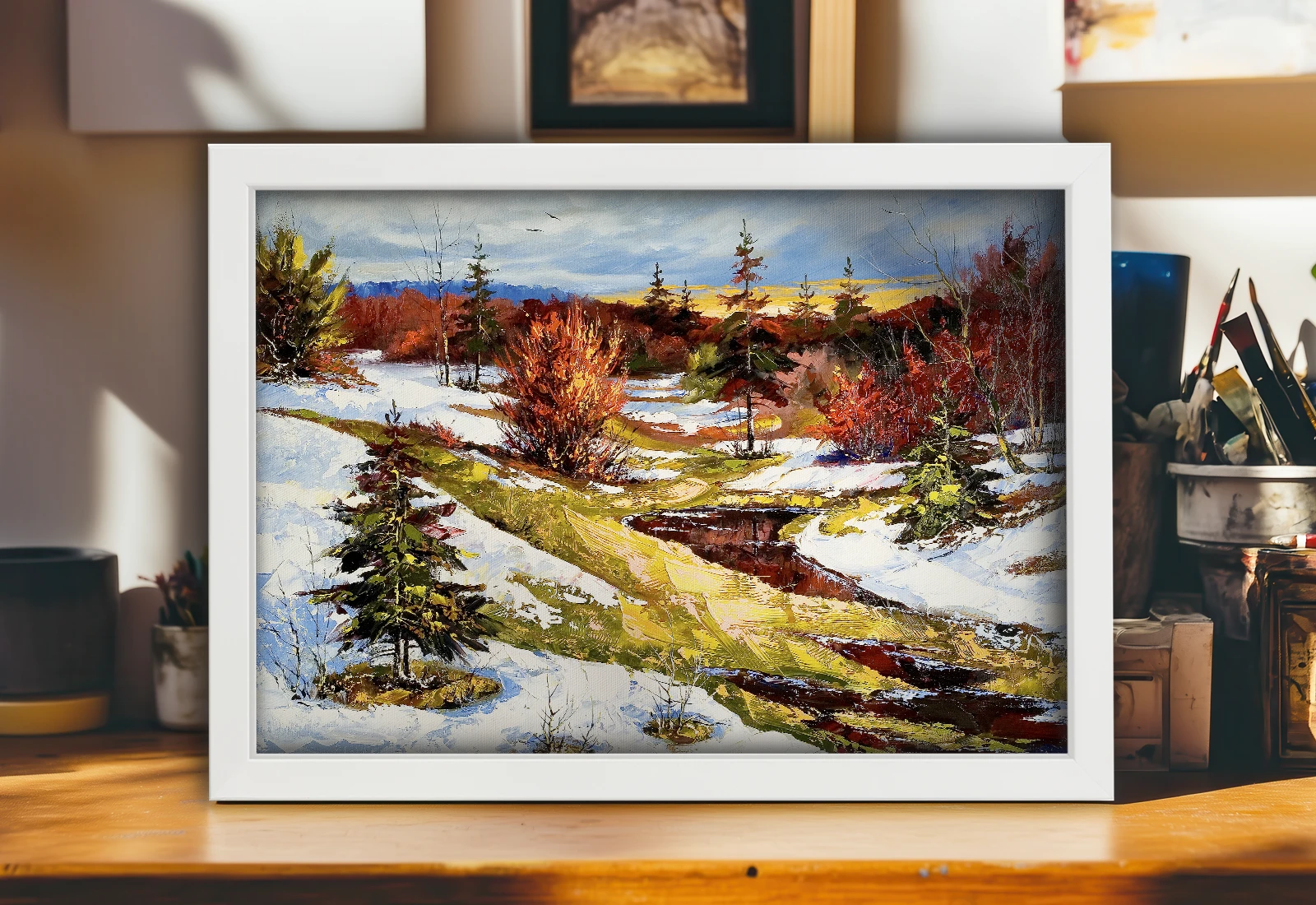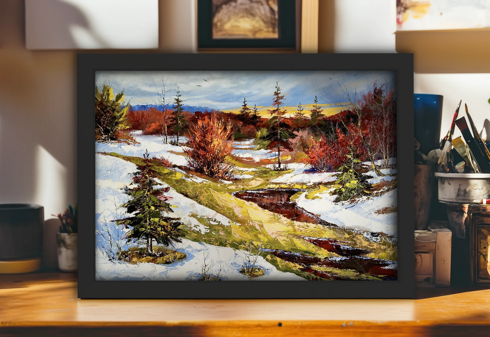 Tabloul este înrămat elegant într-o ramă neagră, scoțând în evidență intensitatea frunzișului arămiu pe fundalul zăpezii imaculate și al munților albaștri. Datorită utilizării cernelurilor latex ecologice, culorile rămân saturate și vii.