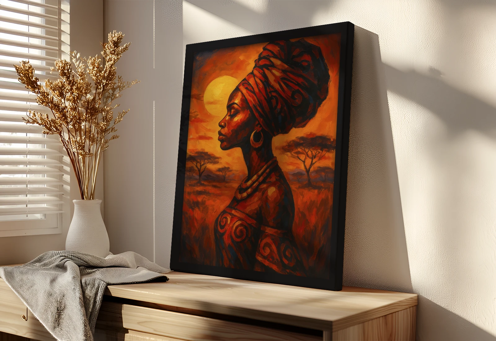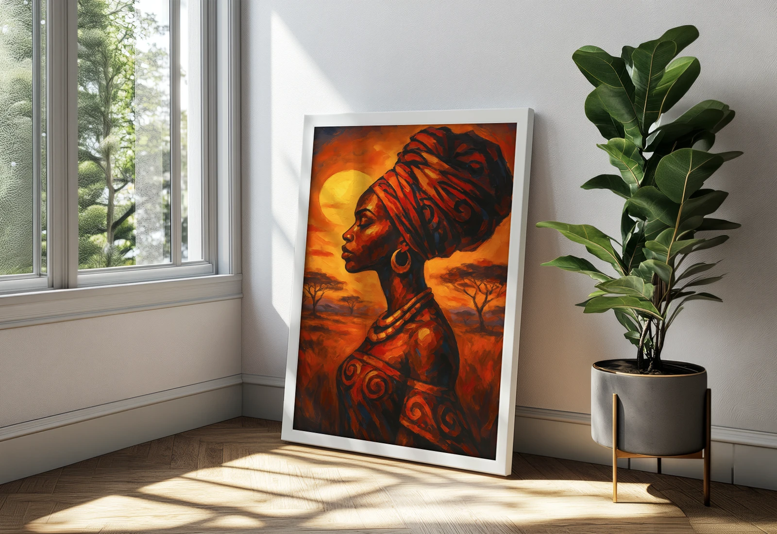 Tabloul este înrămat elegant într-o ramă albă, subliniind grația și demnitatea profilului feminin pe fundalul savanei. Datorită utilizării vopselelor latex ecologice, culorile rămân saturate.