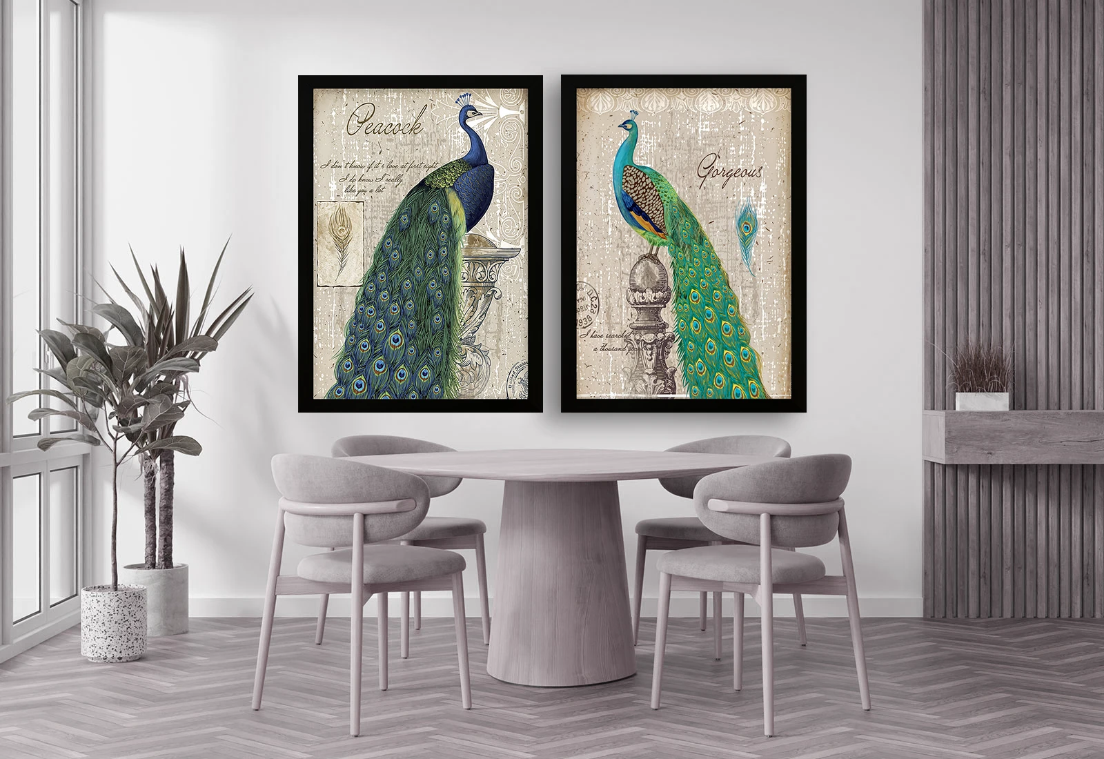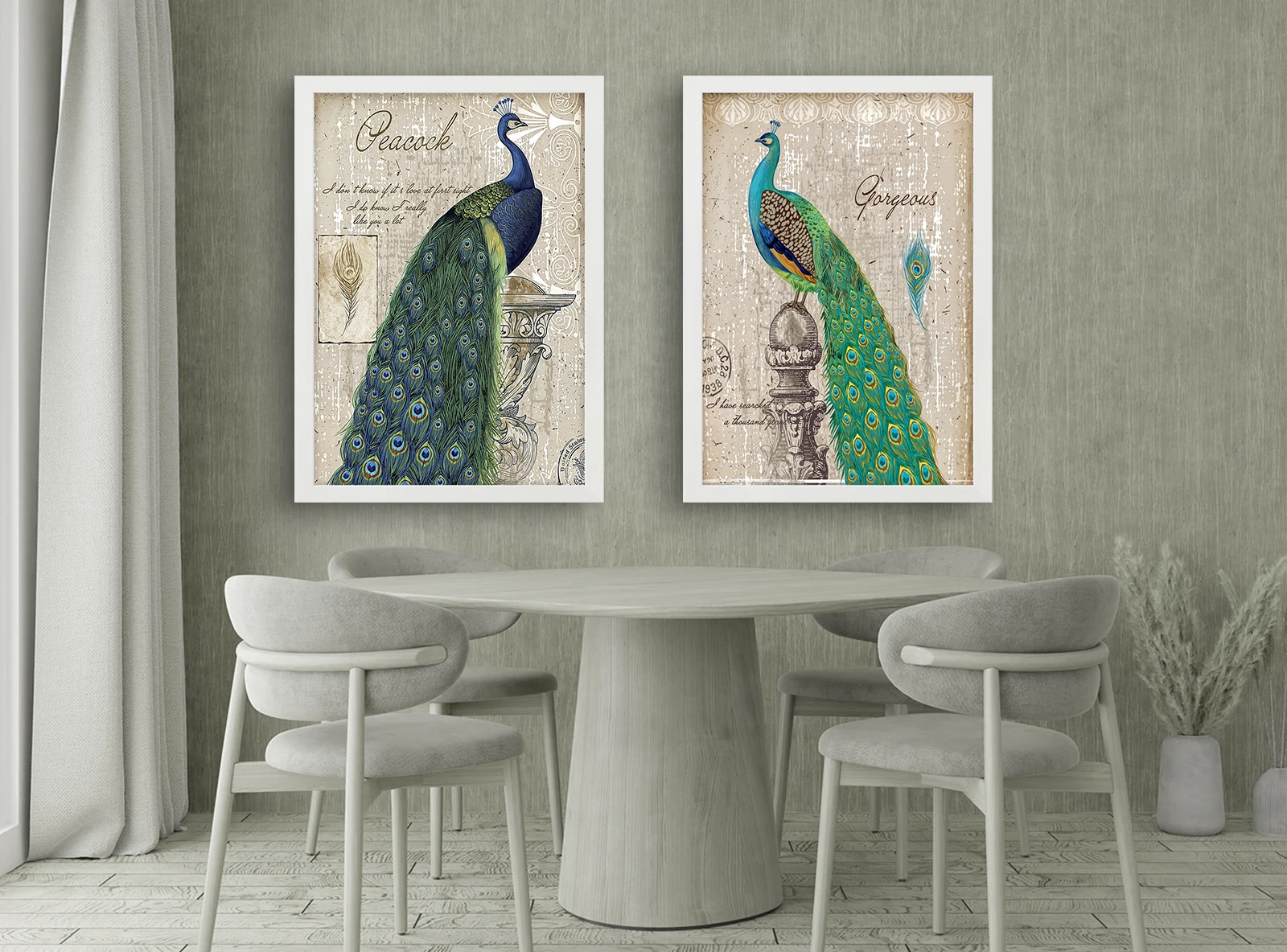 Privind această pânză, simt rafinamentul ilustrațiilor vintage. Este o imprimare latex de înaltă calitate pe pânză naturală, care redă cu măiestrie culorile smarald ale penajului păunului și textura nobilă a fundalului antichizat.