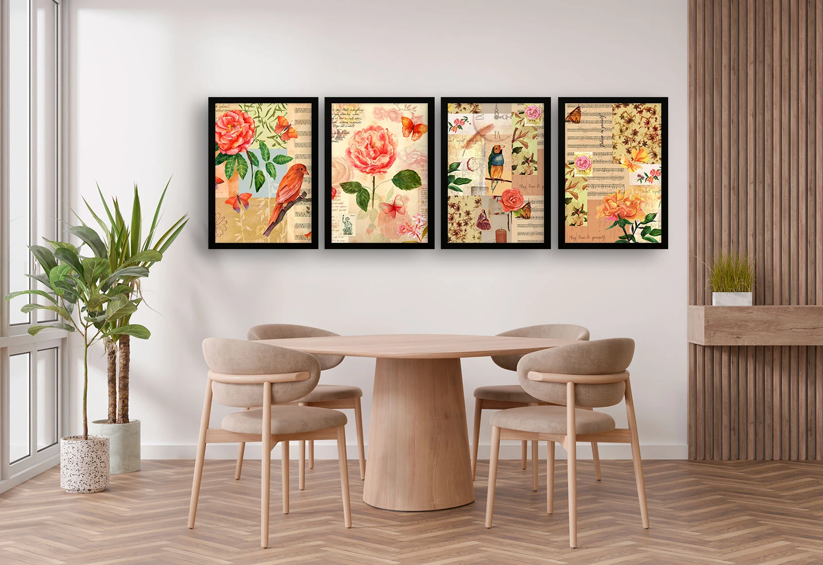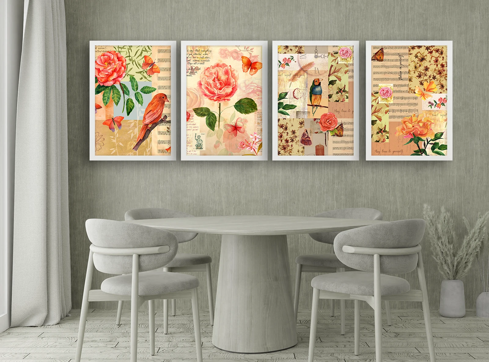 Setul include patru tablouri înrămate elegant în rame albe, permițând crearea unei compoziții armonioase pe perete. Datorită utilizării vopselelor latex ecologice, nuanțele pastelate și detaliile fine rămân clare.