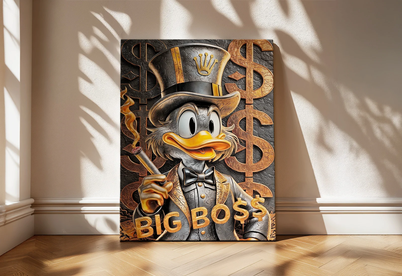 ✅ Tablou pe pânză Scrooge McDuck Big Boss. Imprimare latex, nuanțe de negru și auriu cu imitație de textură. Ideal pentru birou. ⭐ tablouri md - Art-Design.md