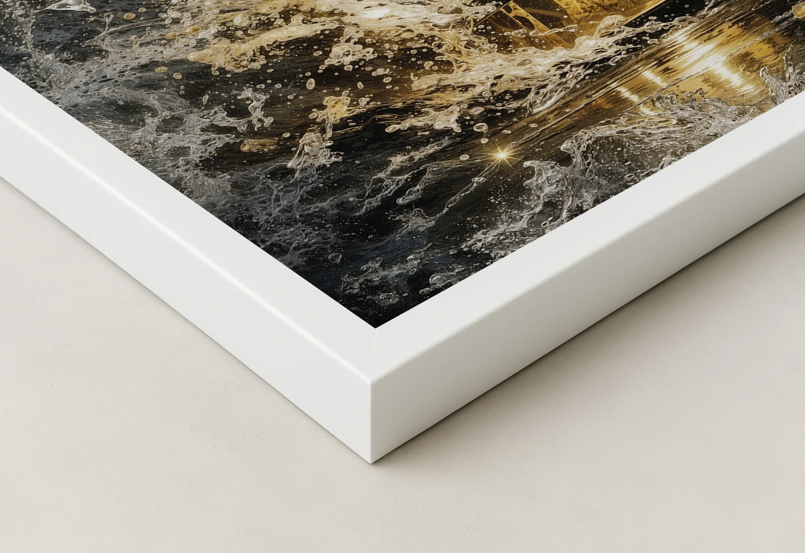Lucrarea prezintă o sticlă de șampanie surprinsă în momentul impactului cu lichidul, creând stropi aurii spectaculoși.