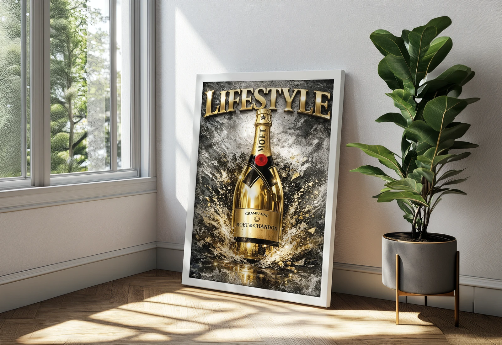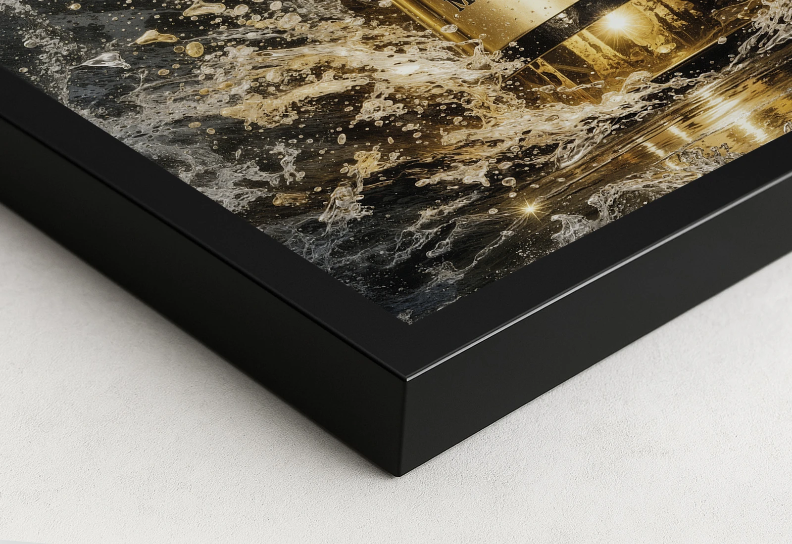 ✅ Tablou cu rama cu șampanie și stropi aurii dinamici. ✓ Contrast puternic și detalii clare ale sticlei. 🚚 Livrare în Chișinău și Moldova. ⭐ Art-Design.md