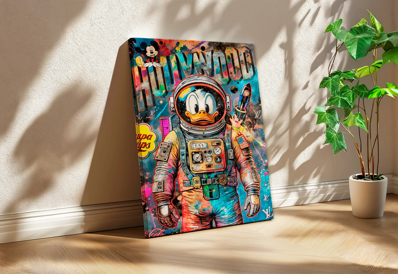 Privind această pânză, simt un val incredibil de energie creativă și pozitivism. Este o imprimare latex de înaltă calitate pe pânză naturală, reprezentându-l pe Donald Duck în ipostaza unui astronaut curajos pe fundalul strălucitor al Hollywood-ului neon.