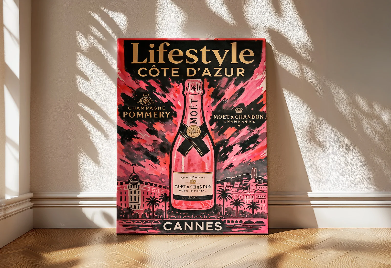 Privind această pânză, simt atmosfera rafinată a Rivierei franceze și a unei sărbători eterne. Este o imprimare latex de înaltă calitate pe pânză naturală, care redă cu măiestrie estetica Luxury Lifestyle cu șampanie roz Moet & Chandon pe fundalul panoramei orașului Cannes.
